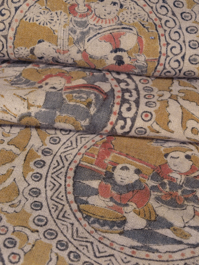 きなり色の地に、唐草と唐子のあらわされた絵皿の文様が染められている、綿の和更紗のはぎれです。 江戸末から明治期ごろにつくられたと思われるアンティークのお品です。さまざまな動きのある唐子がコミカルで、おもしろみのある意匠です。 全体的にアンティークなりのうっすらとしたくすみがあり、両耳直近との色差が若干ありますが、そのほかに目につく大きなしみやよごれ、褪色、穴などのダメージはなく、この時代のものとしてはきれいな状態です。生地の力もあります。 |