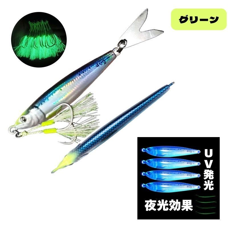 FG-53【送料無料】ルアー 80g メタルジグ 鉄ジグ スーパーライトジギング グリーン 夜光 UV発光 針付き ジグ 釣り用品 釣り具 フィッシング