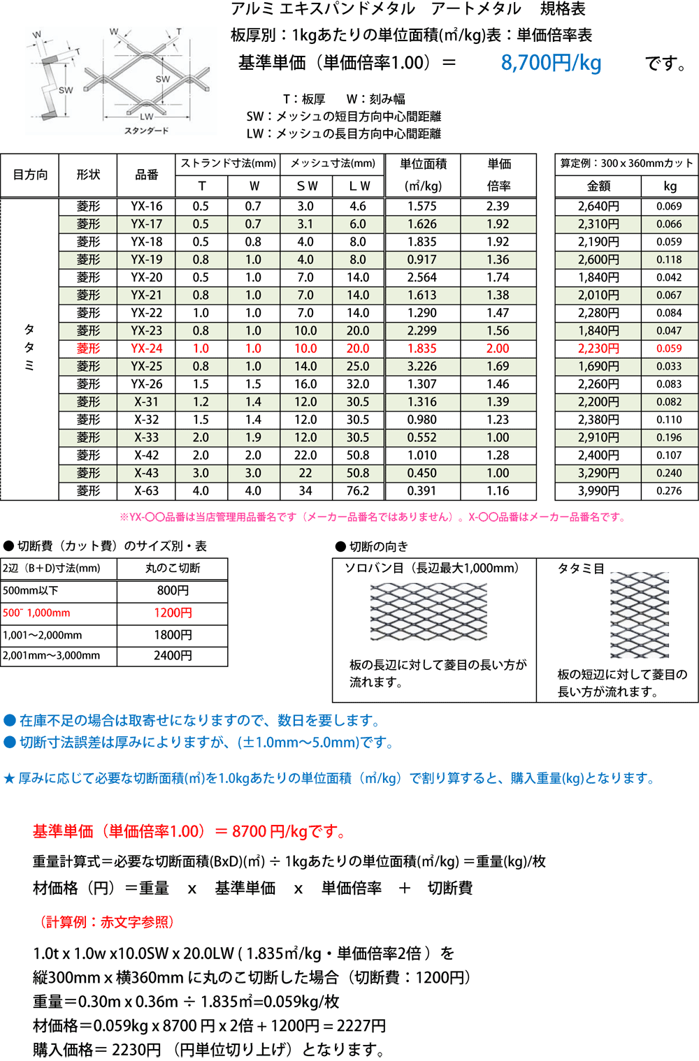 ただし板厚・メッシュ形状により単価倍率が違います。