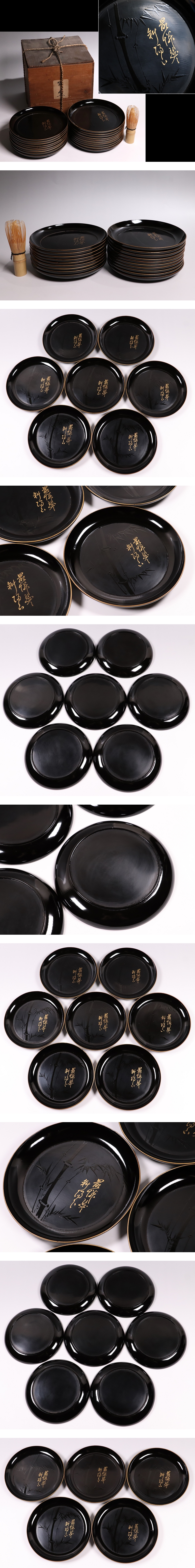 ◇木製漆器 時代物 竹図 闇蒔絵 金蒔絵 黒塗銘々盆 十九客 15.8cm 木皿 菓子皿 木箱入り MA17◇