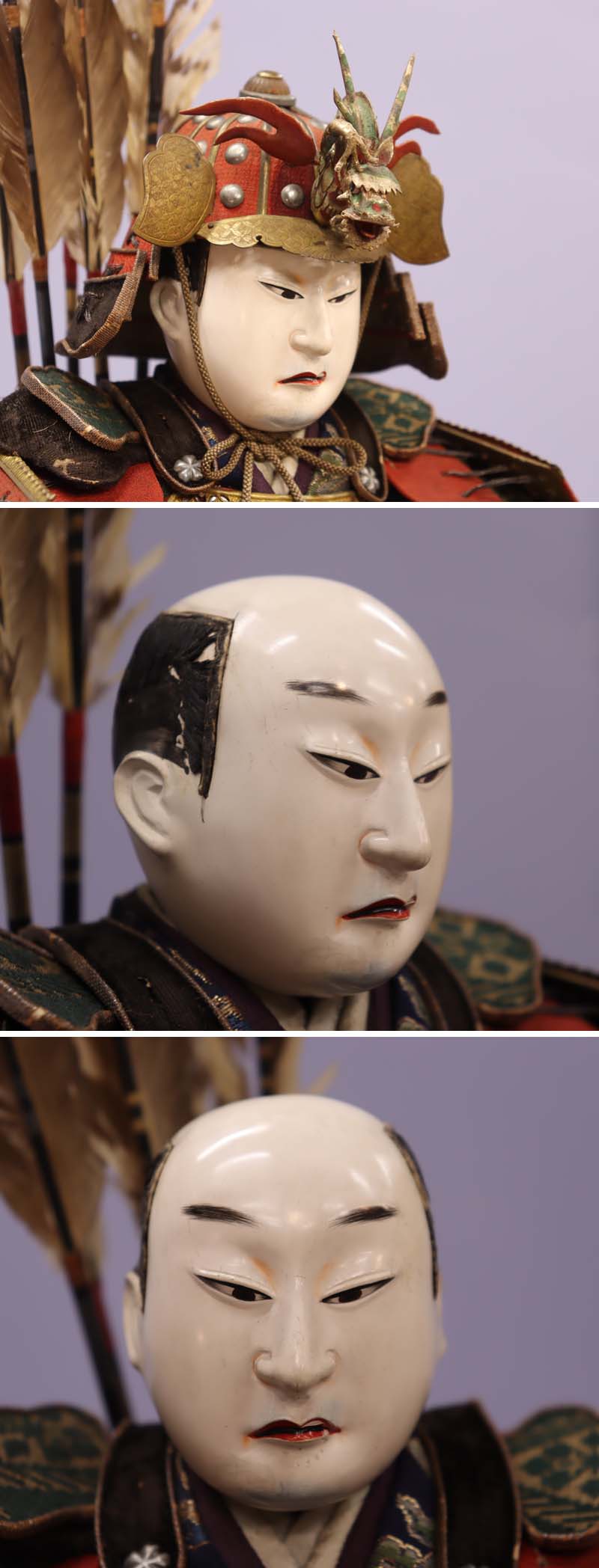 左右の目の間に細かい胡粉のヒビがあります (画像上から6枚目参照)。