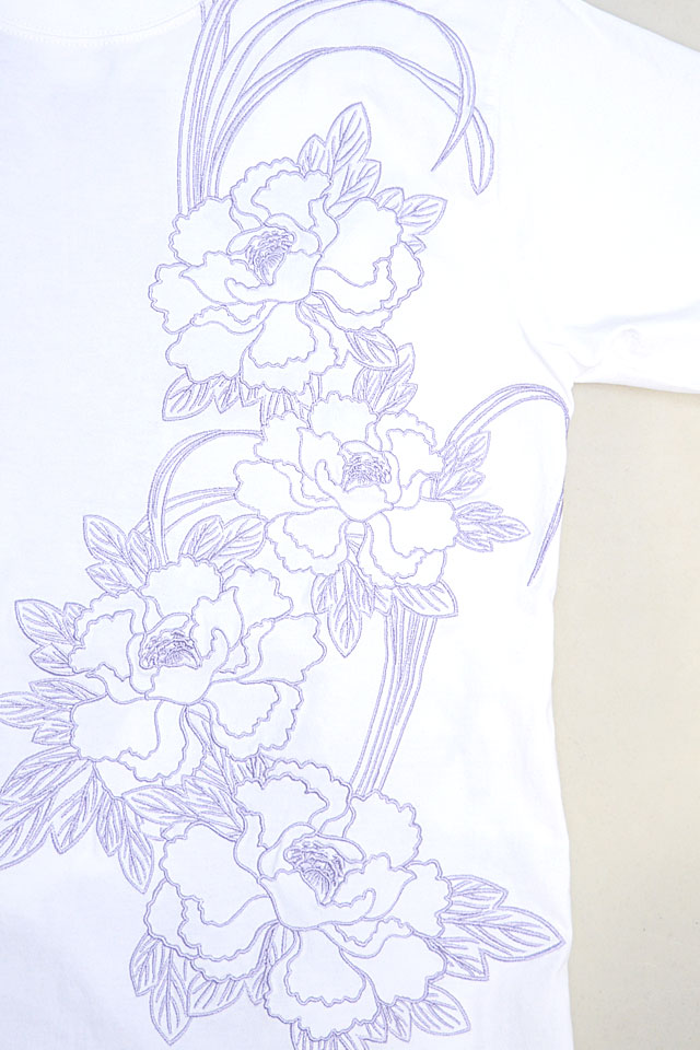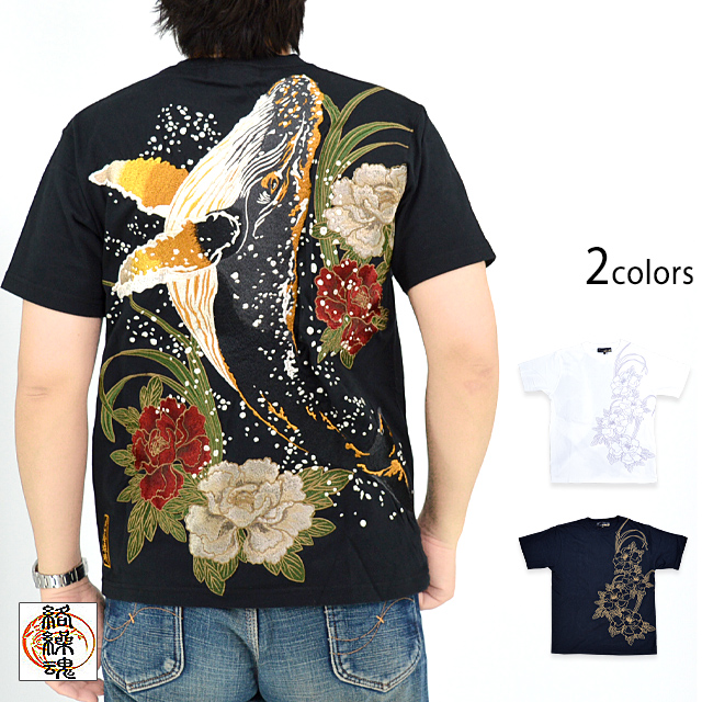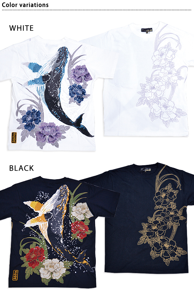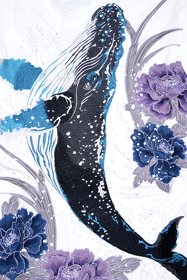 絡繰魂さんから「粋 古のザトウクジラ半袖Tシャツ(242052)」のご紹介です。 重みすら感じるほどの刺繍量が魅力的な粋シリーズから、最新作が登場しました。 今回は巨大なザトウクジラを背中にダイナミックに落とし込みました。 裾にはブランドロゴを印風に刺繍しました。 フロント左身頃には牡丹の花をアウトラインのみで刺繍。 こちらはシンプルに表現することで、メリハリのあるデザインになっています。 ボディーには、刺繍に負けないコシのある綿100%の生地を使用。 | |||||||||||||||||||||||||