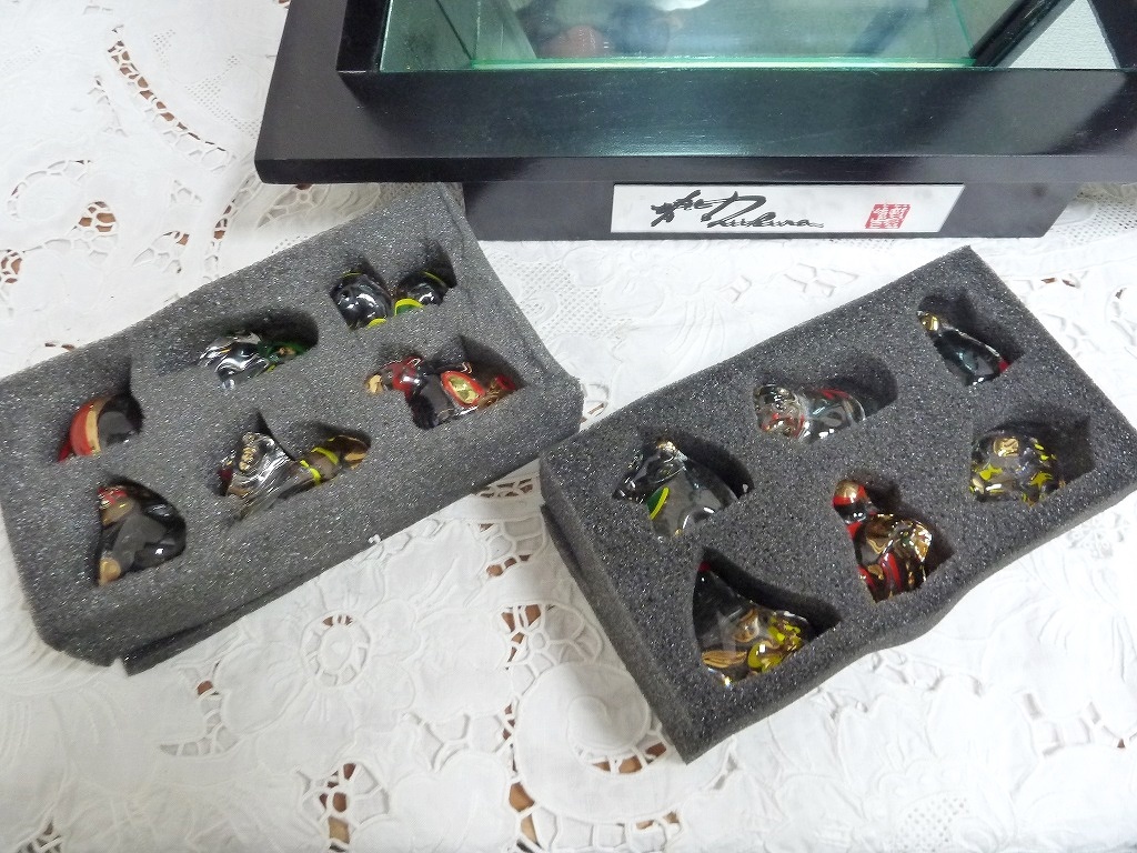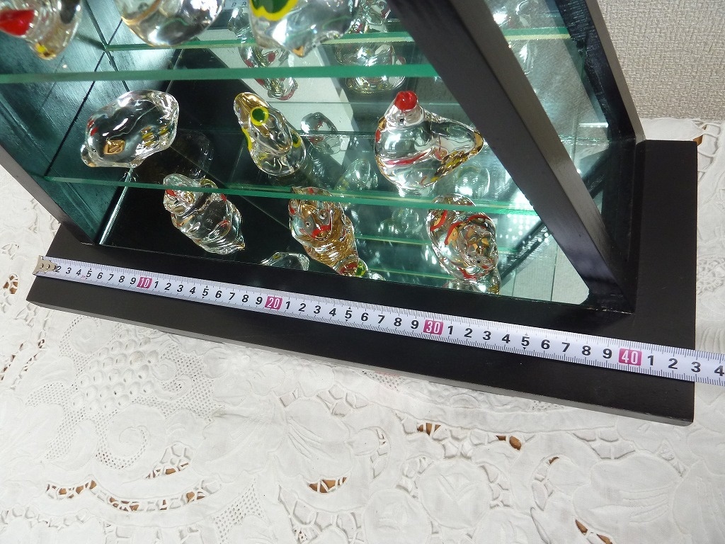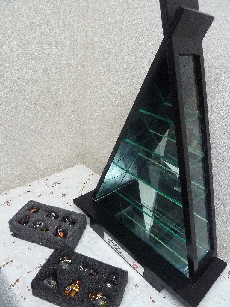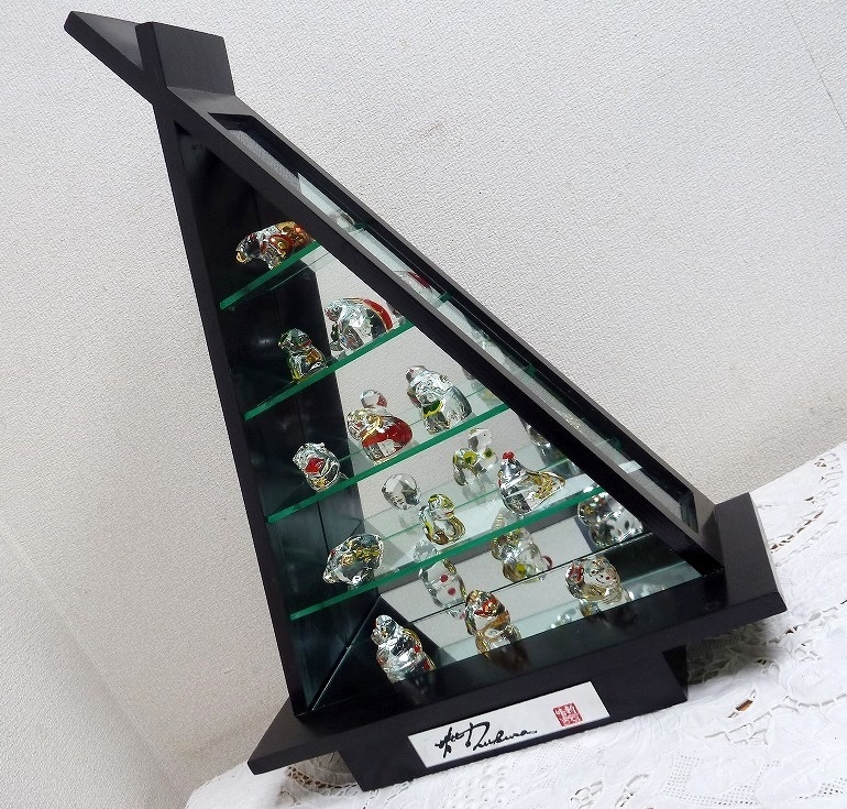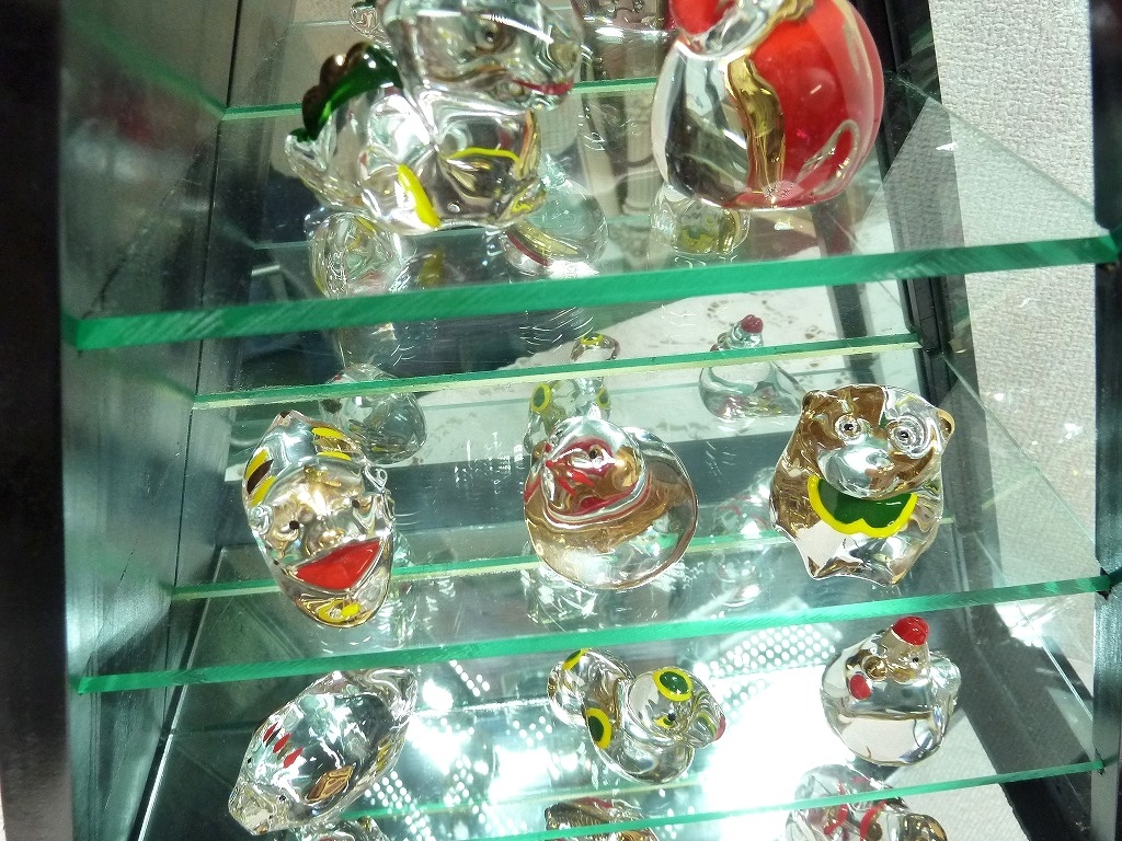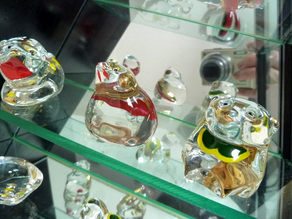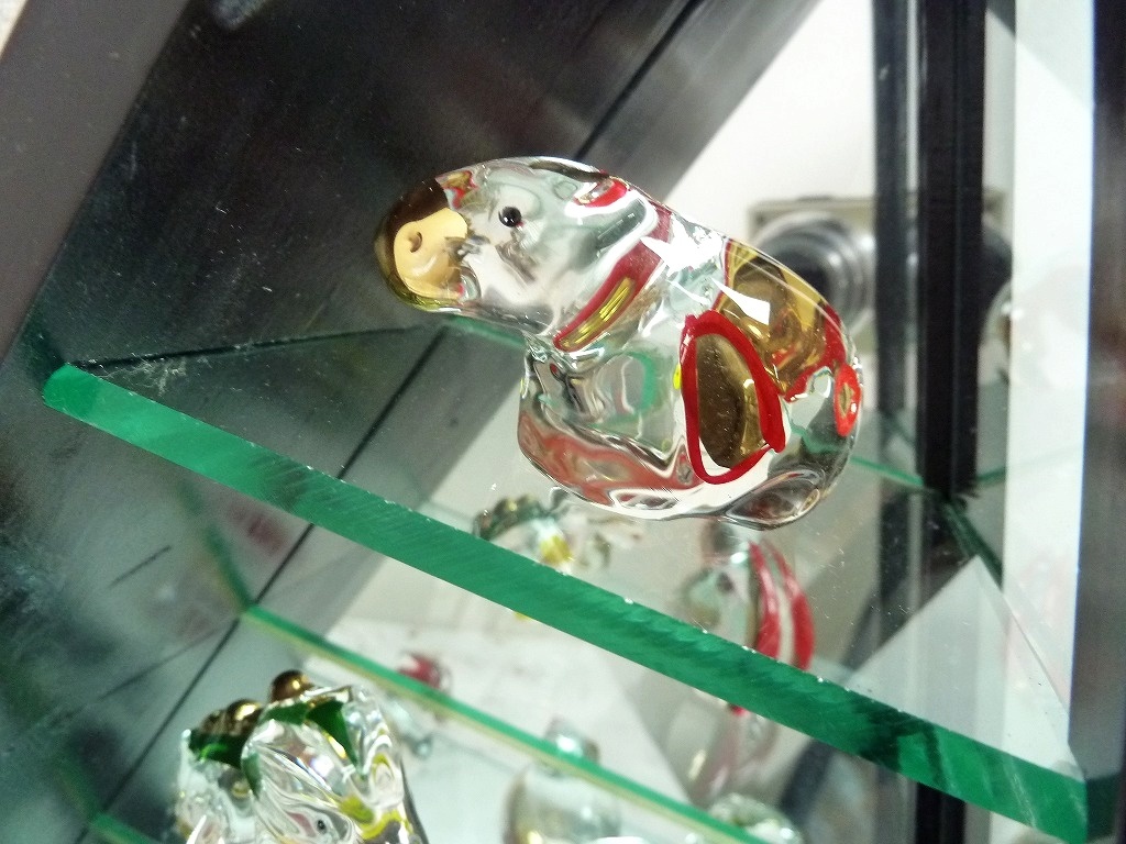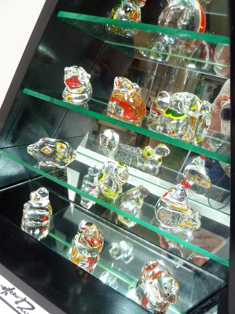 ショーケースにクリスタルガラスの十二干支オブジェ。