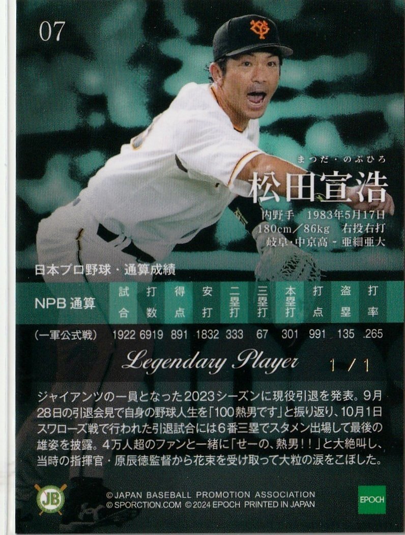 1of1【#07 松田宣浩 読売ジャイアンツ】1/1 レギュラーカードパラレル HOLOGRAM C EPOCH 2023 日本プロ野球OBクラブ ホログラフィカ