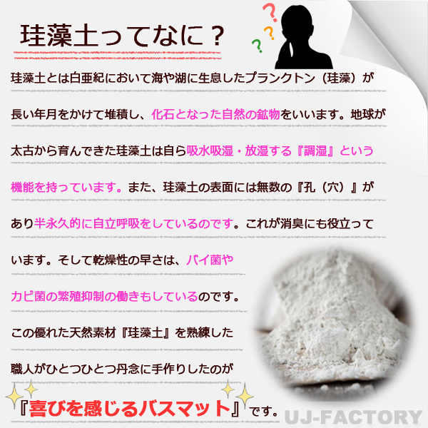 | 【 ここがポイント 】 ★普通「バスマット」は布製ですが、常識をくつがえした、この「珪藻土マット」が大ヒット中! ★「脅威の吸水力」と「脱臭・湿度調整効果」、「カビやダニの発生を抑制」、意外と大変なのはバスマットの洗濯。毎日洗って乾かしての繰り返し。お天気が悪いと乾きも悪く、風呂上りの足裏はスッキリしません!一度使用すれば、もう手放せません♪ ★珪藻土は、植物性プランクトンが長年にわたりちく推積して化石化した天然の鉱物です。自然が育てた珪藻土は、自律的に吸湿、放湿を繰り返す「調湿」の機能があり天井や壁材としても使用されています。吸水力は、珪藻土の無数にあいた約0.001mm~0.003mmの小さな穴が水分を一瞬で吸収し一定量を超えた水分は自発的に気化して放出します。 ★吸水力が落ちた場合は、付属のサンドペーパーでお手入れするだけです。
