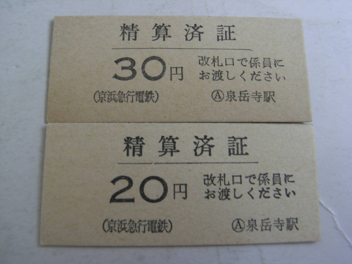 2枚/京浜急行電鉄 精算済証 20円・精算済証 30円 泉岳寺駅 京急