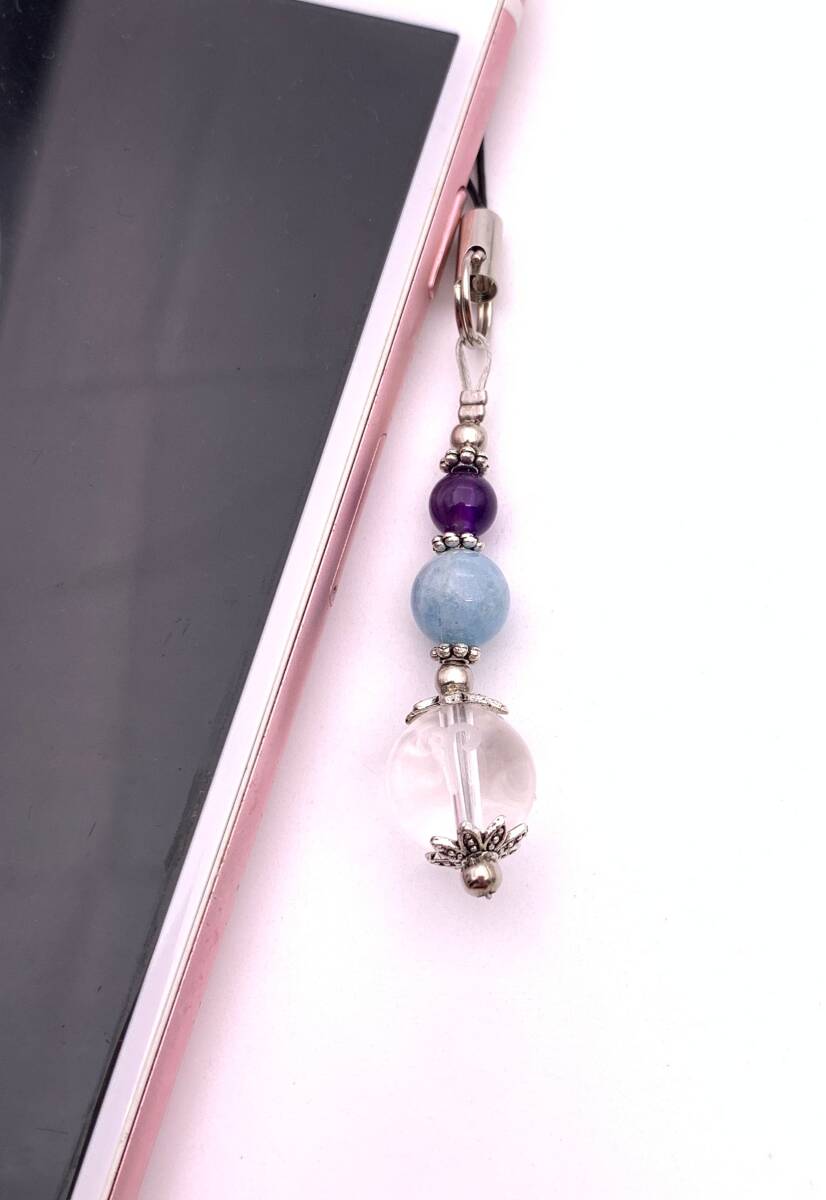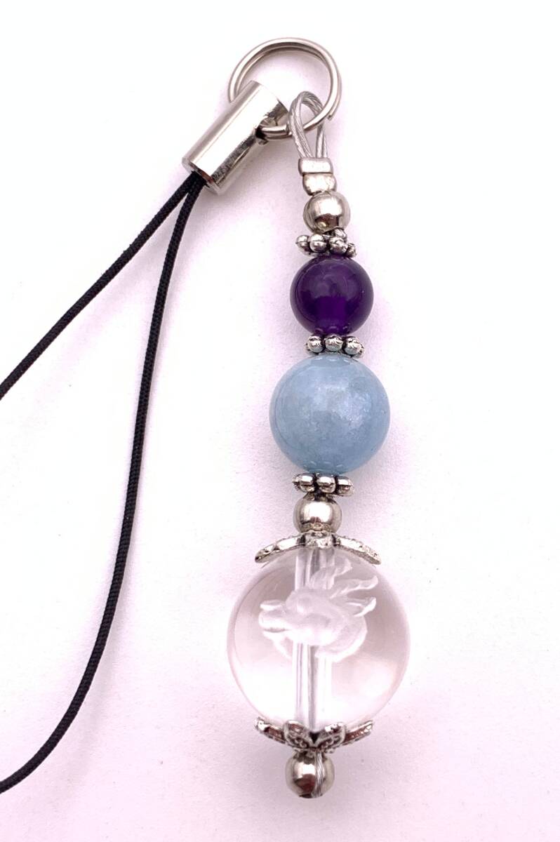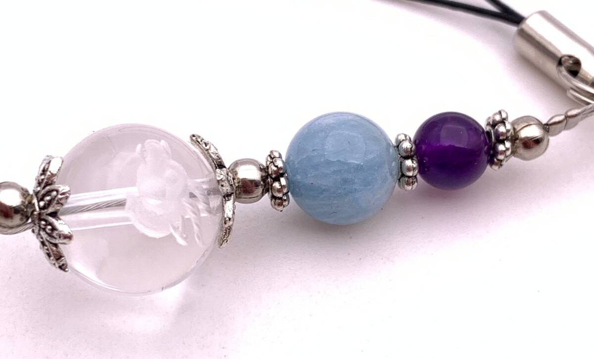 天然石彫り水晶12星座(おひつじ座)&アクアマリン&アメジストのストラップ