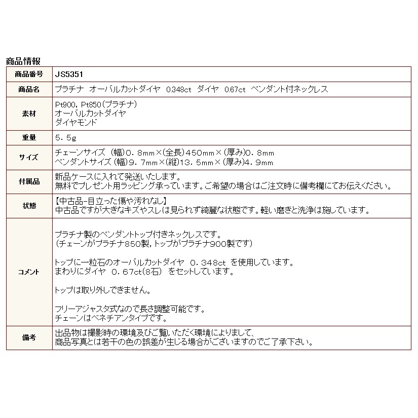 | 商品名 | プラチナ オーバルカットダイヤ 0.348ct ダイヤ 0.67ct ペンダント付ネックレス |