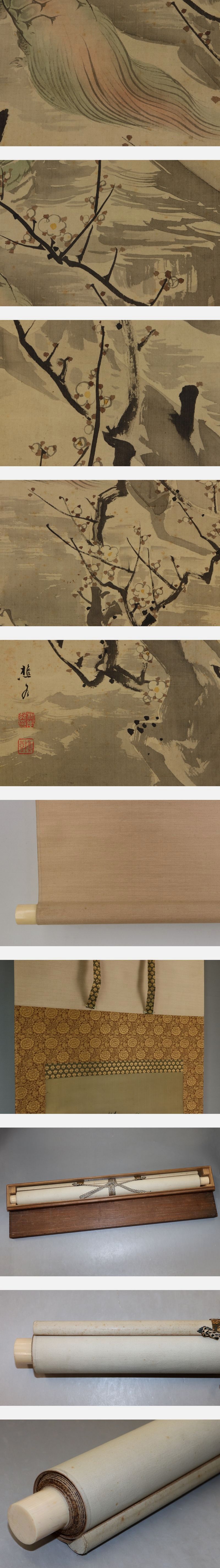 根本樵谷 ねもと-しょうこく(1860*-1913) 明治-大正時代の日本画家。 安政6年12月30日生まれ。宮川堤月に学び,また洋画も修める。 のち雲谷派の杉谷雪樵に師事。花鳥山水画に優れた。 大正2年1月8日死去。55歳。上総(千葉県)出身。本名は郁二郎。別号に枕雪。 本紙は、染み、汚れ、軽い皺、ヤケがあります。 表装は、染み、汚れ、軽い折れ、皺、軸先に汚れと小傷があります。 【サイズ】 作品 横約41cm×縦約110cm 表装 横約55cm×縦約200cm |