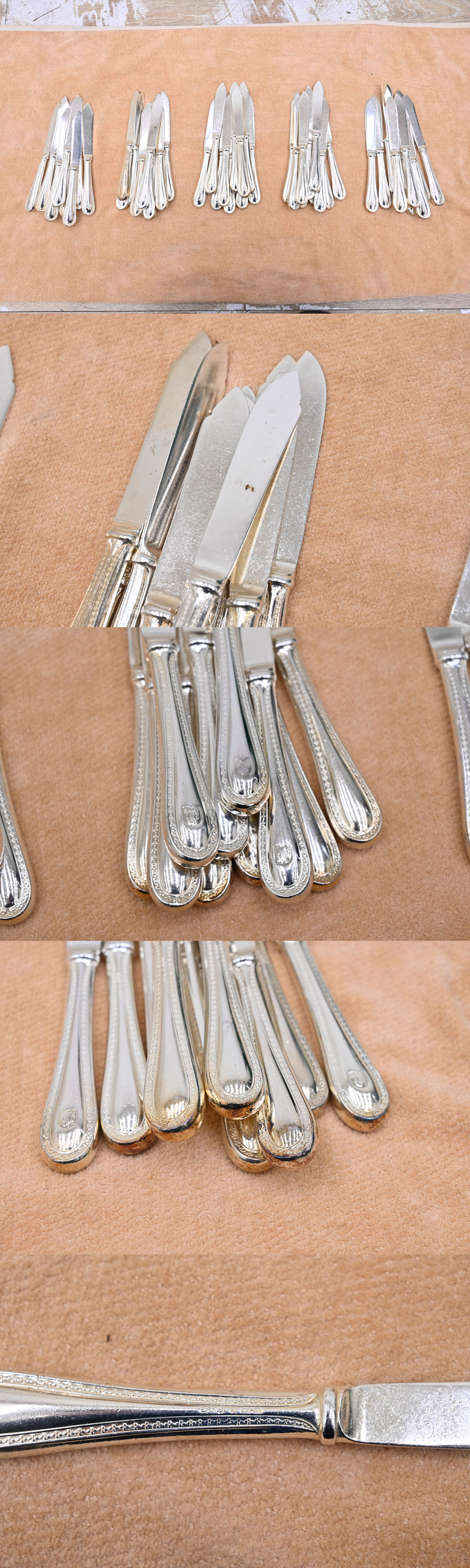 ----------------------------------------------------------------------------------------- ●送料や注意事項は必ずご確認下さい。不明な場合は落札前に必ず質問下さい。落札後にトラブルになるケースが多発しております。● ◆コンディションは写真・文章にて記載して有りますが、全てのキズの写真は掲載致しておりません。大きなダメージを除き見落とし、記載漏れが有る事はご了承下さい。 ◆当サイトにて出品する商品は多種多彩で、当方商品知識の無い物も多数ありますので落札後の質問やメンテナンス等にはお答えできません。 ◆入札された時点で、画像、文章をご理解していただいたものと判断させていただきます。不明な点は前もってQ&Aからお願い致します。入札後の質問やお電話等でのキャンセルは一切受け付け致しません。 ◆商品説明に「ノークレーム」と記載しているものに関しては、如何なる状況で届いても保証致しません。詳しくは注意事項の「商品到着後について」の最後に記載しておりますのでご確認下さい。 ---------------------------------------------------------------------------------------- ナイフ50本、中古品の出品です。 全長 20.5㎝ 中古品ですので使用に伴うキズ、汚れ、一部変色有ります。 こちらノークレームノーリターンでの出品となります。 他にもカトラリーを出品予定か出品中です。 | ||