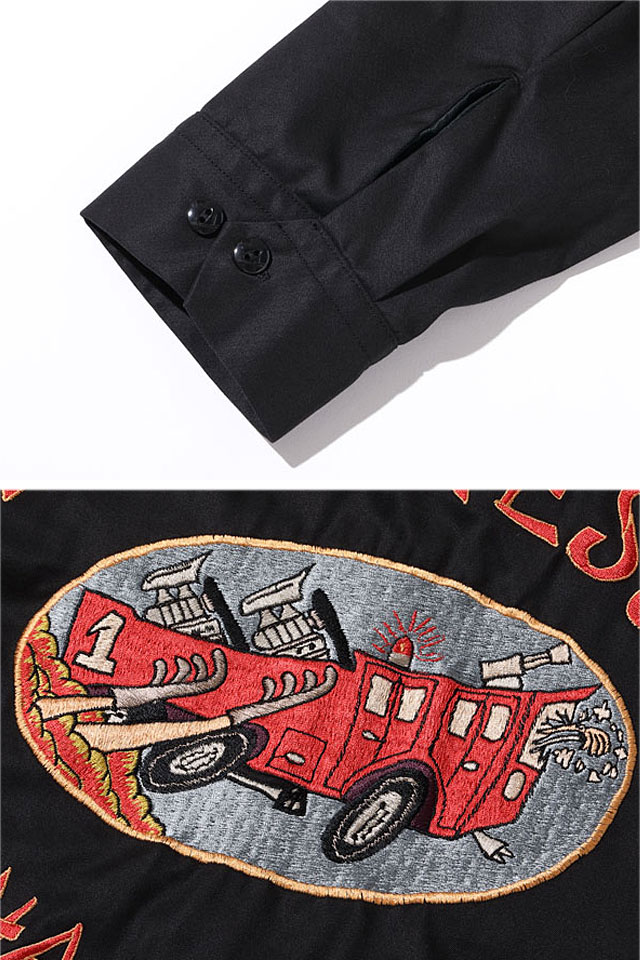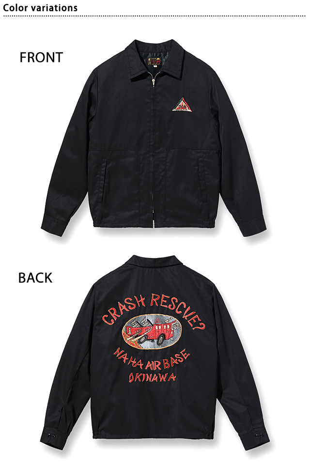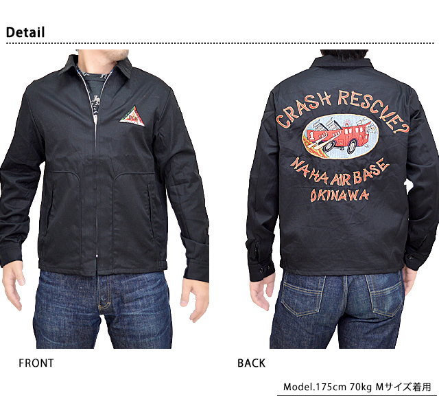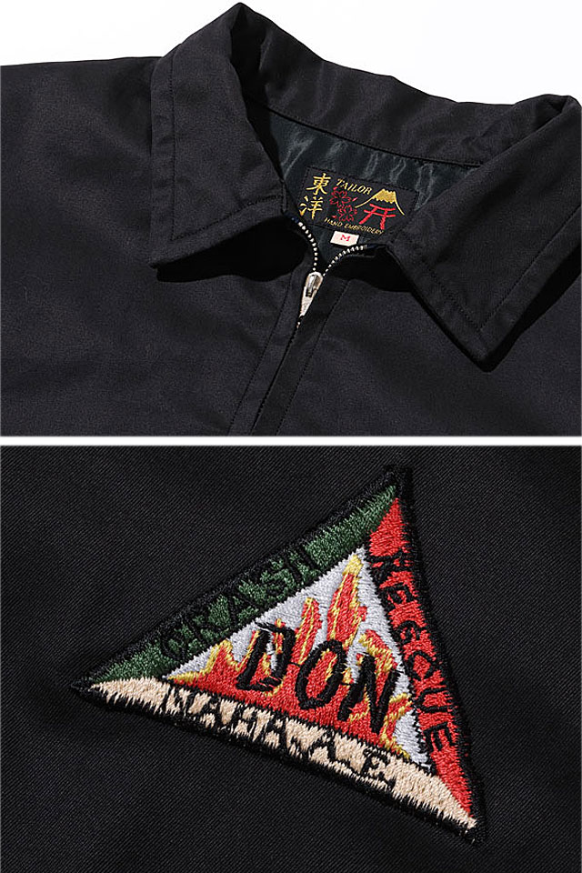探求心と情熱を持って、上質なアイテムを製作し続けている「テーラー東洋」から、Late 1950s Style コットン沖縄ジャンパー「CRASH RESCUE ? NAHA AIRBASE OKINAWA」(TT15177)のご紹介です。 沖縄の那覇基地に駐留していた米兵のカスタムオーダーで作られた、通称オキナワジャンパーの登場です! 背中には火災現場に急行するホットロッド風の消防車がコミカルに刺繍されています。 CRASH RESCUEとは、ジェット燃料を積んだ航空機が火災事故を起こした際にCRASH TURNOUTという特殊な防火服を着用し、危険をかえりみず消火・救出活動にあたる、米軍の空軍基地には必ず配備されている部隊のことです。 フロントはジップアップ仕様。 | |||||||||||||||||||||||||