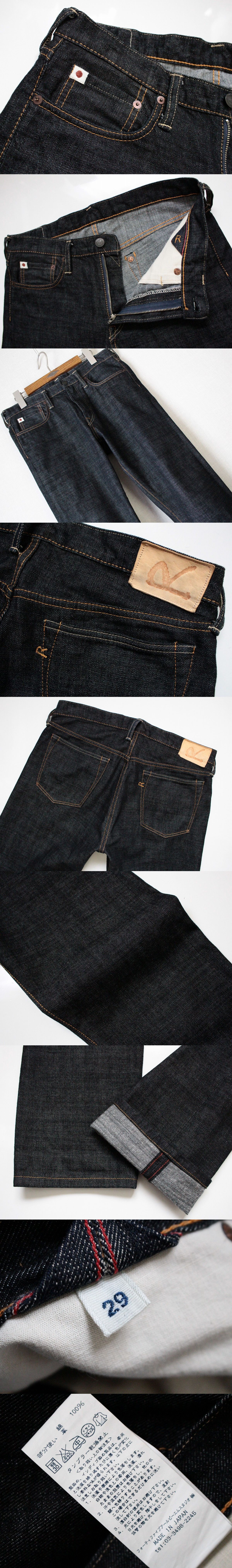 やや薄手のデニム素材で、前はジップフライ、革パッチ、裾にかけて細くなるテーパード、