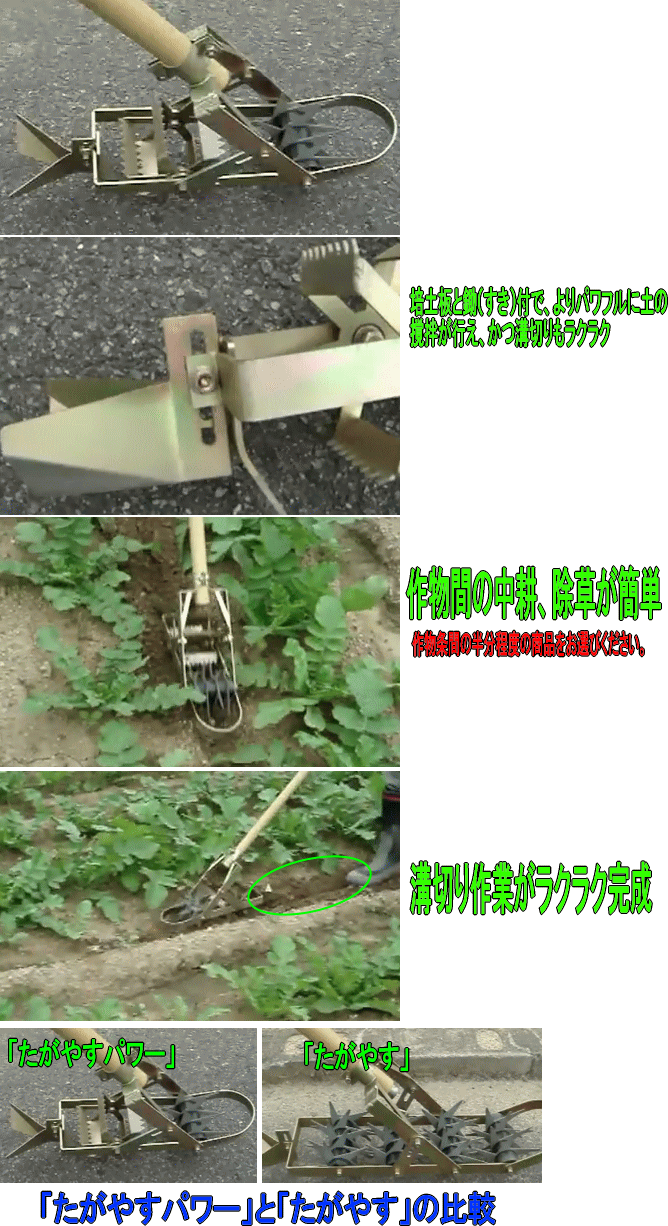 | たがやすより除草能力、土の撹拌能力は優れています。 ・溝切りラクラク ・中耕効果パワーアップ ・除草能力パワーアップ | ![]() |