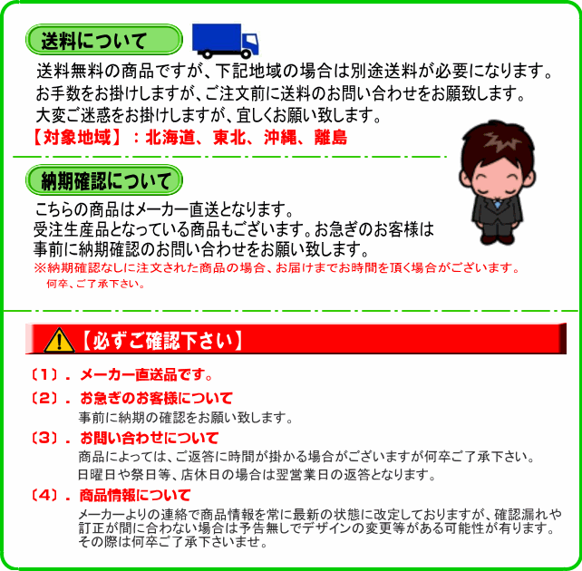 | (1).お届先が「北海道・沖縄・離島」(※商品によっては「東北」を含む)の場合は 別途送料が掛かります。 お届先の情報をもとに送料を設定させて頂きますので、お支払については 当店より送料のお知らせの後にお願い致します。 (2).一部商品については「個人様宅」へのお届の場合、別途送料が掛かる場合が ございます。 (3).送料のお問い合わせの際は、以下の情報をご連絡下さい。 ・お届け先の郵便番号 ・お届け先が「個人様宅」or「法人様」 |