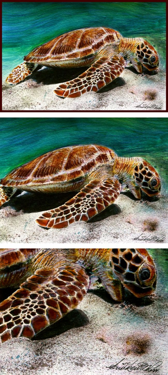 | 寸評 | 水彩と色鉛筆の混合技法により、海亀が海藻を貪る姿を緻密に描き出した、芸術性の高い一作です。 色鉛筆を巧みに使い分け、海亀の甲羅の硬質な質感や、鱗一枚一枚のディテールまで驚くほど精緻に表現されています。 エメラルドグリーンの海に落ちる影のコントラストが美しく、野生の息吹がすぐそこに感じられるような臨場感に溢れています。 アシッドフリー(中性)の高級ペーパーに描かれた、変色しにくい保存性の高い作品です。 一点ものの原画ならではの、画家の情熱がこもった筆致を直接お楽しみいただけます。 |