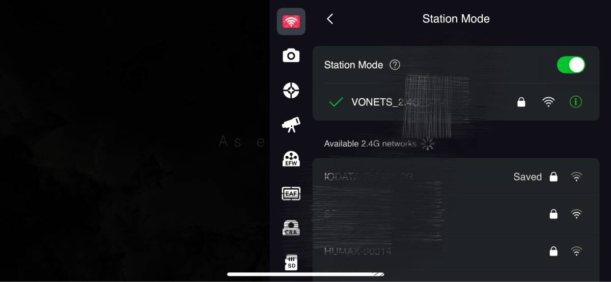 ④ Station Mode画面でVonetsが選択されていることを確認します。更に、アプリからASIAIRのShut Sownを行い、電源スイッチの操作で再起動を行います。