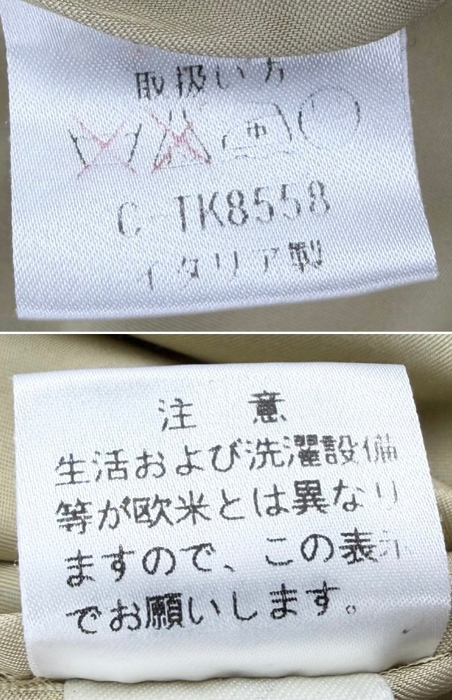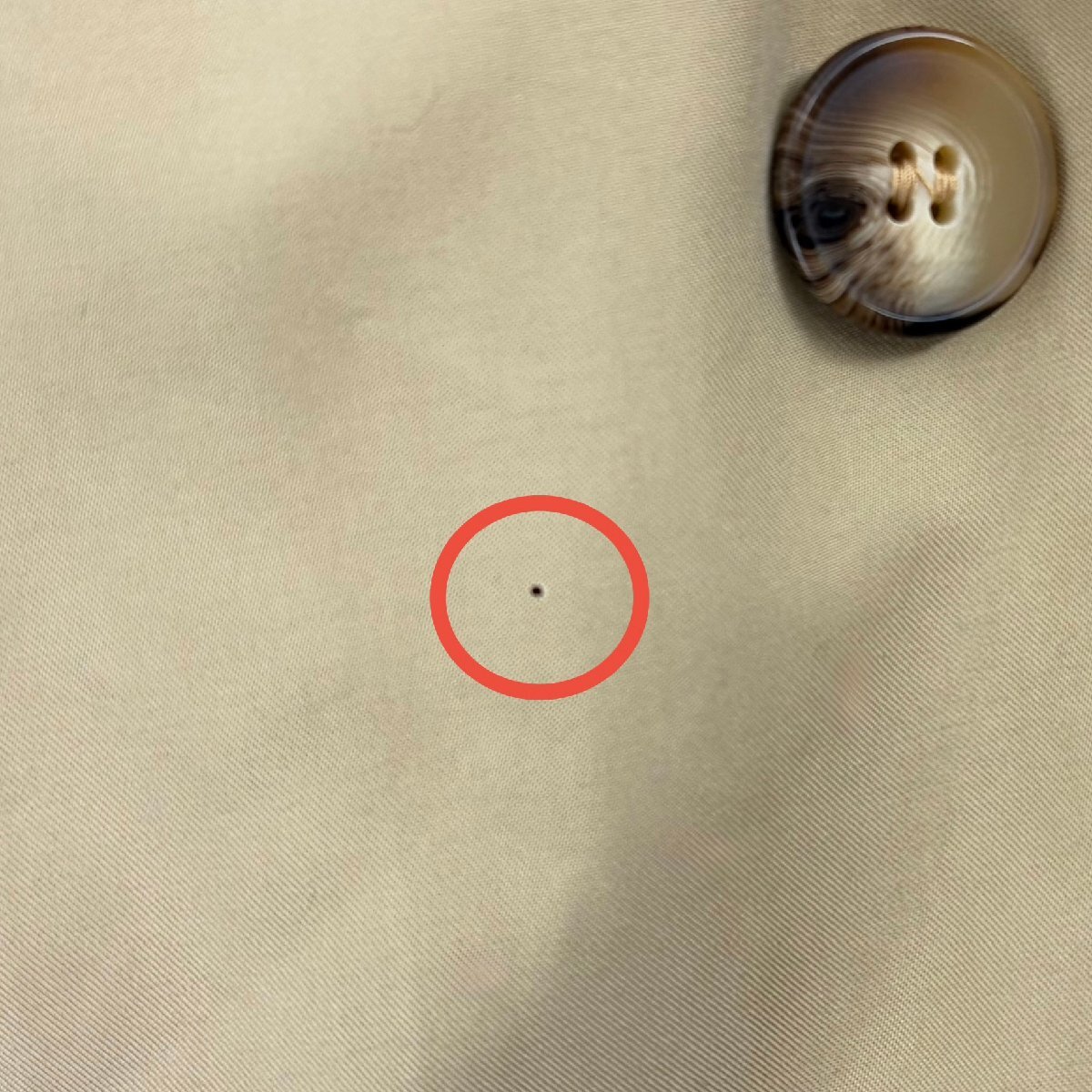 | 状態 | 見返しの付いた部分なので目立ちにくいですが、第3ボタン付近の右前身頃部に1mm程のわずかな穴あきが見られます。(10枚目画像参照) その他、多少の使用感はありますが、目立つ汚れやダメージ等なく、まだまだお使い頂ける商品です。 |