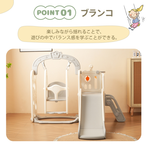• 【1台で4役をこなす!オールインワン遊具】1ブランコ、2バスケットゴール、3滑り台、4収納スペース。//おうちがいちばんの遊び場に悪天候でも安心:雨・雪・猛暑でもおうちで元気に遊べる!時間を気にせず遊べる:営業時間も順番待ちもなし!好きなだけ遊べる外出不要でラクラク:外出せずにすぐ遊べて、ママパパもラクちん!外のリスクを避けられる:ウイルスや花粉の心配なし、安全な室内空間で見守れる//