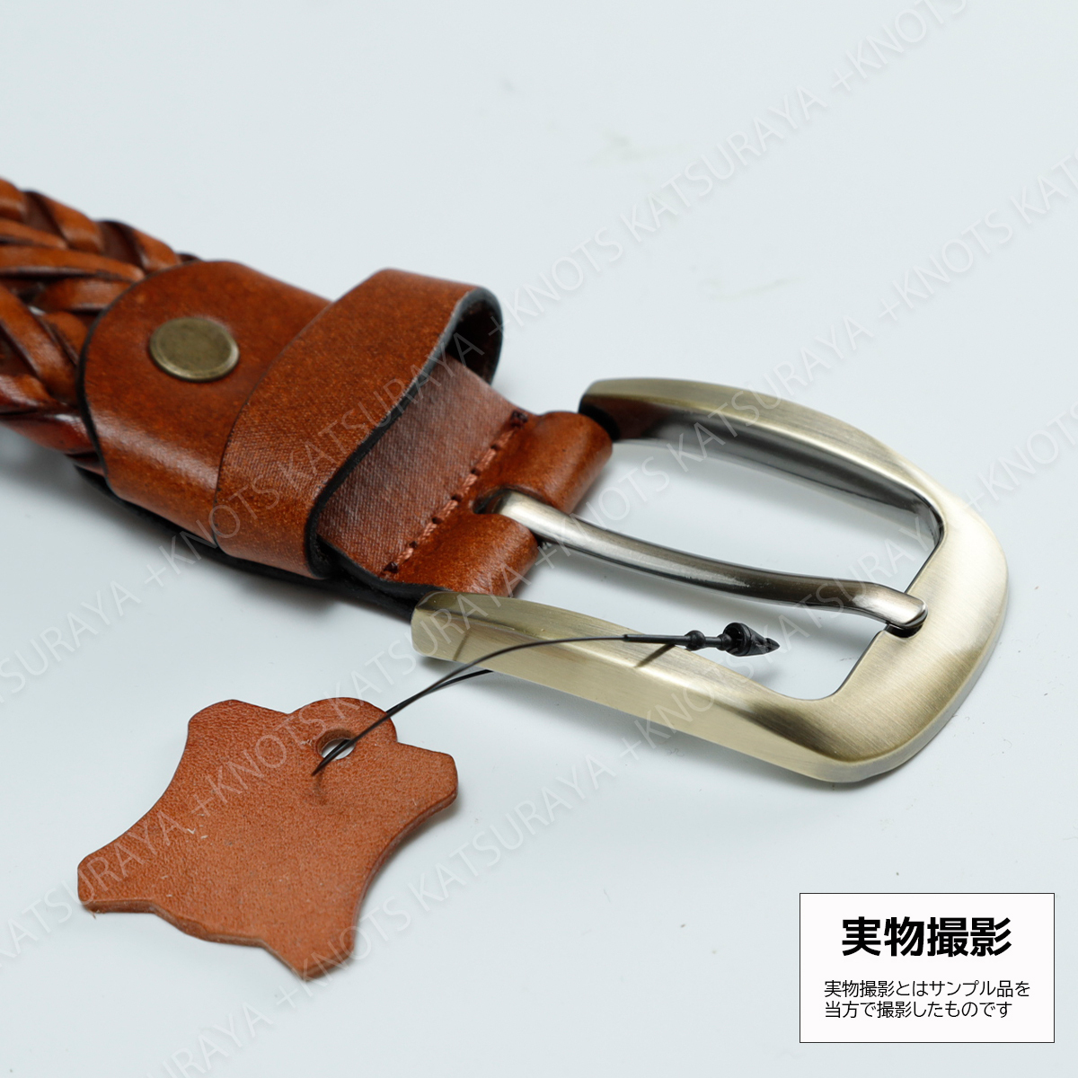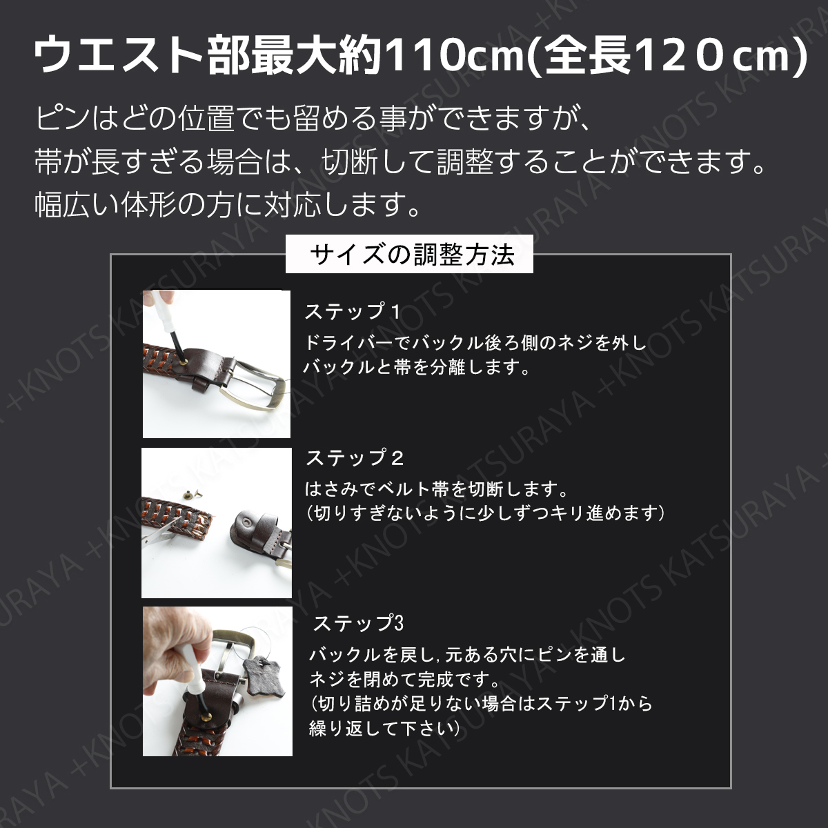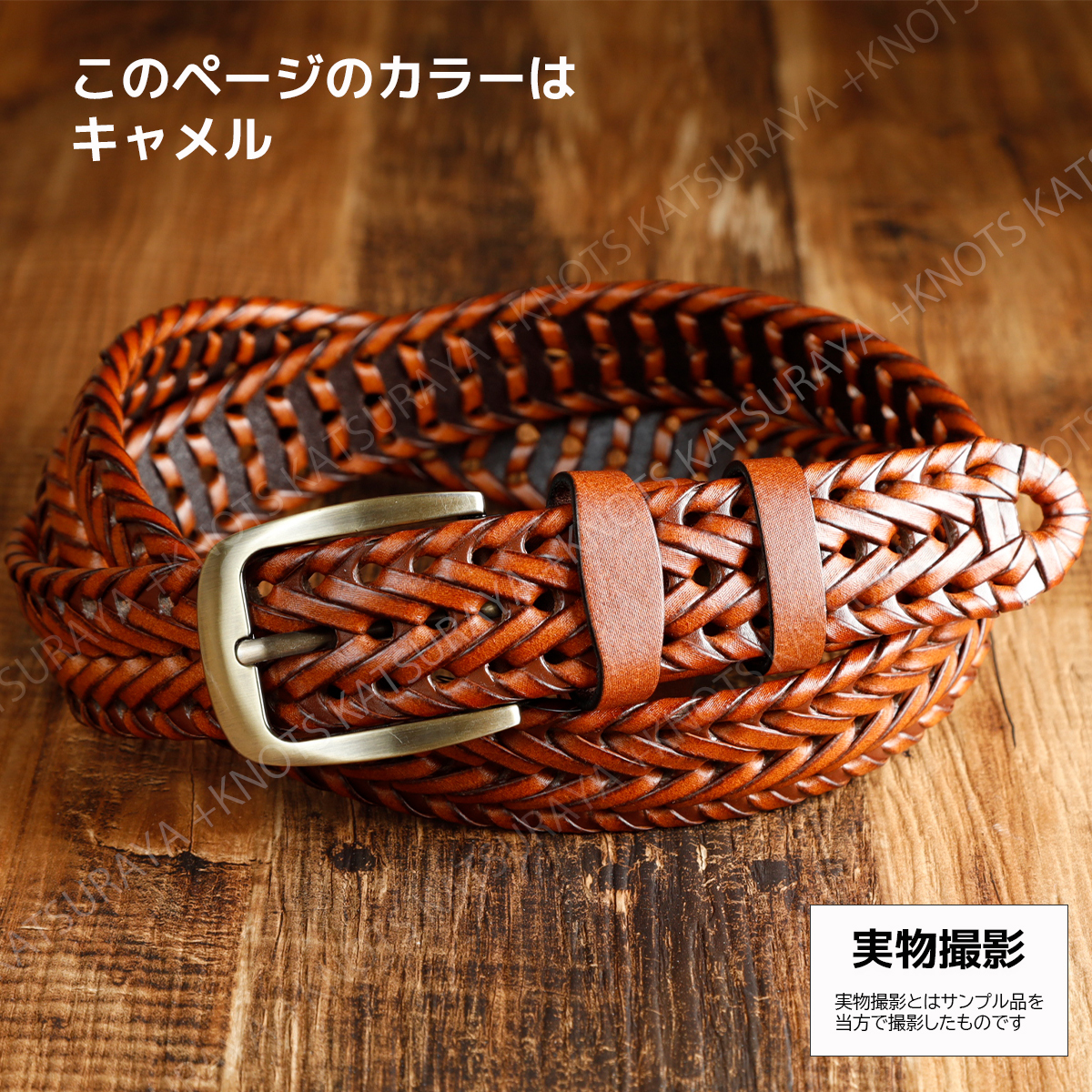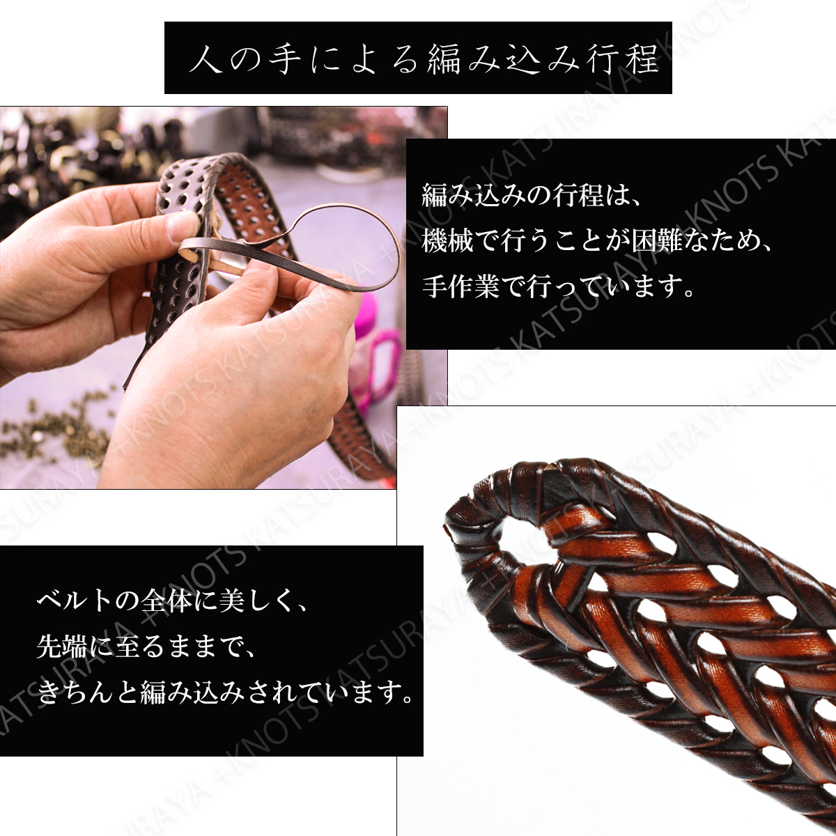 しっかりと存在感ある編み込みベルト、先端に至るまで美しい装飾が魅力、機械では難しい編み込みの行程を手作業で行った高品質タイプです。リアルレザーならでは上品な手触りとツヤ感をお楽しみください。デニムやジーンズ、チノパンなどのカジュアル装いに相性がとてもよいです。また、スーツ、スラックスと合わせると大人の魅力をぐっと引き立ててくれます。本革ですがメッシュタイプなので通気性が良く、どの位置にもバックルピンが刺せて穴あけ不要、食後の調整なども1㎝刻みで行えるなど使い勝手も良好です。長すぎる場合はバックル部のネジを外しハサミで切断することで調整可能です。