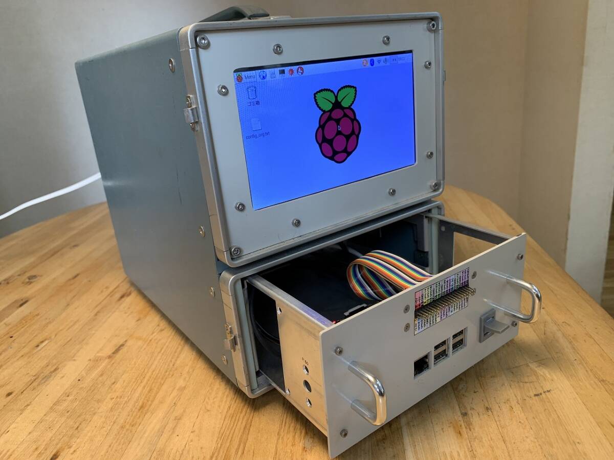 Raspberry Piと液晶ディスプレイ、スピーカーをケースにおさめ一体化しました。USB接続のキーボードとマウス(写真の物とは異なります)も付属しています。GPIOピンも前面パネルに引き出しています。