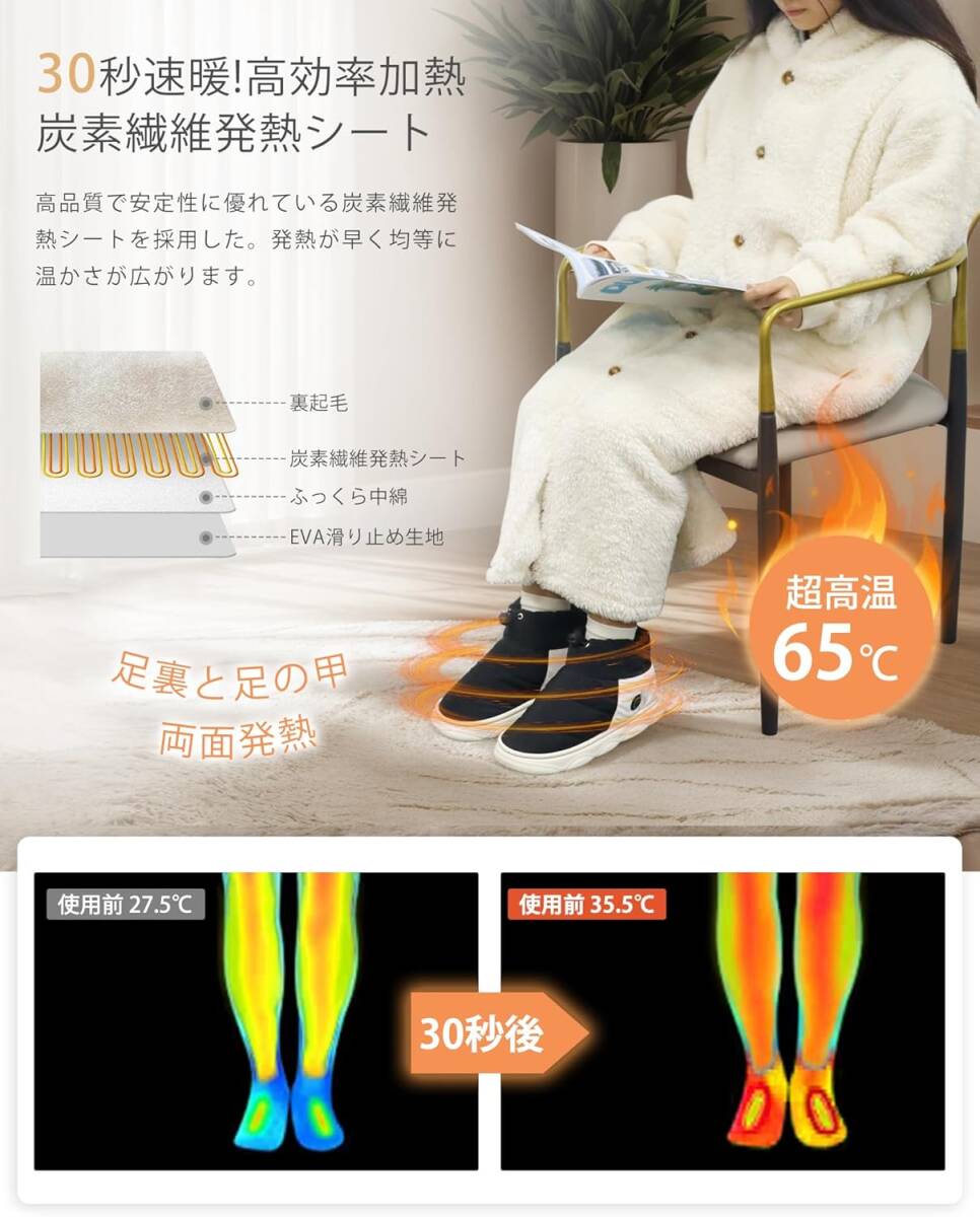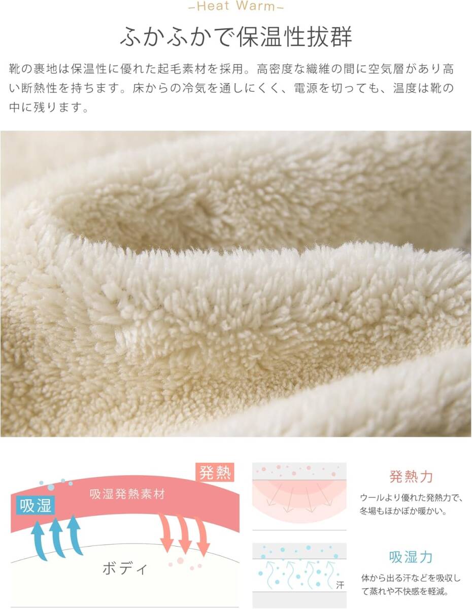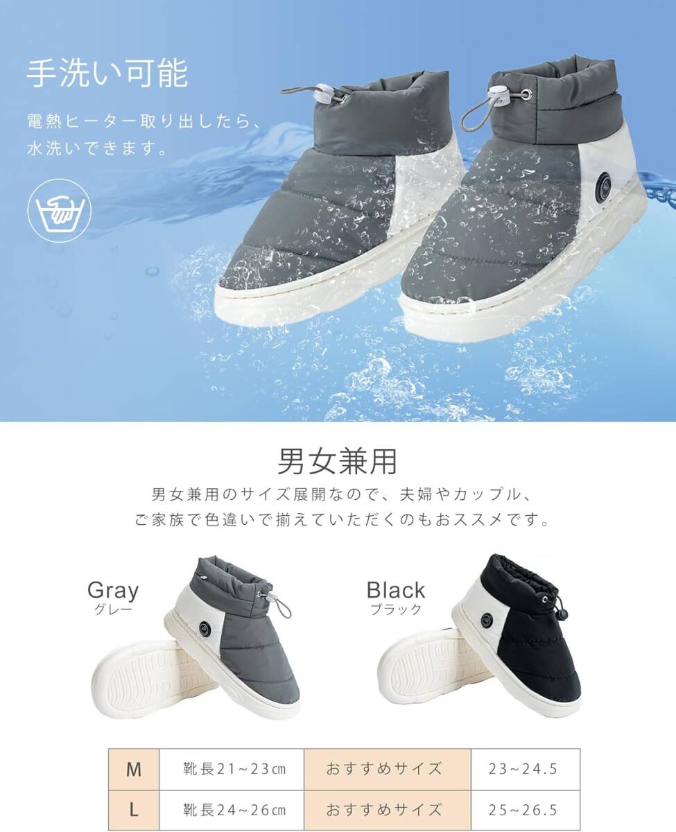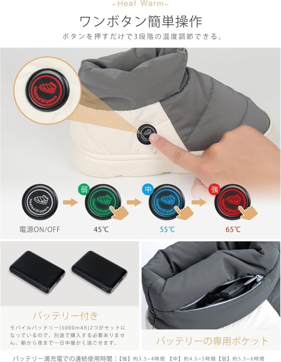 • 表生地:ポリエステル100%(撥水加工)、靴底生地:EVA、加熱材質:炭素繊維、梱包内容:電気スリッパ*1、USBケーブル*1、モバイルバッテリー*2、日本語取扱説明書*1