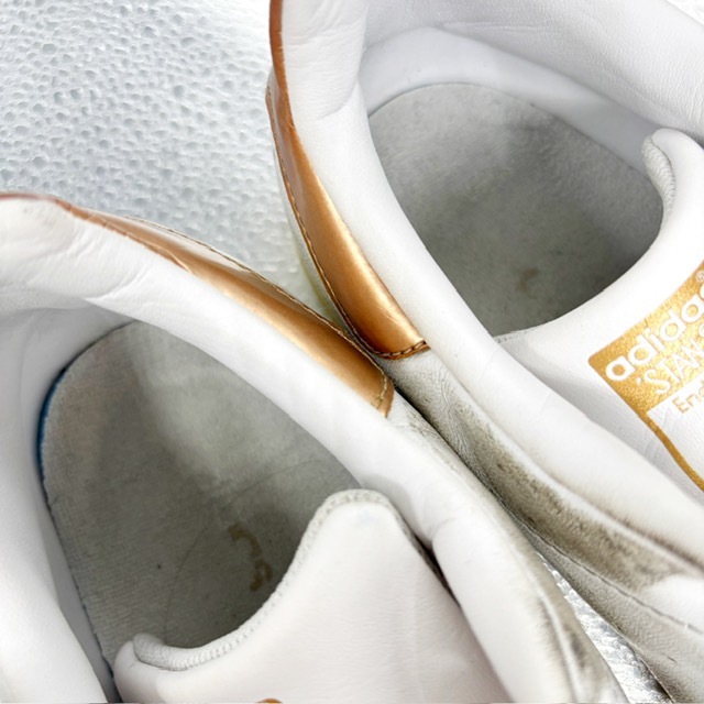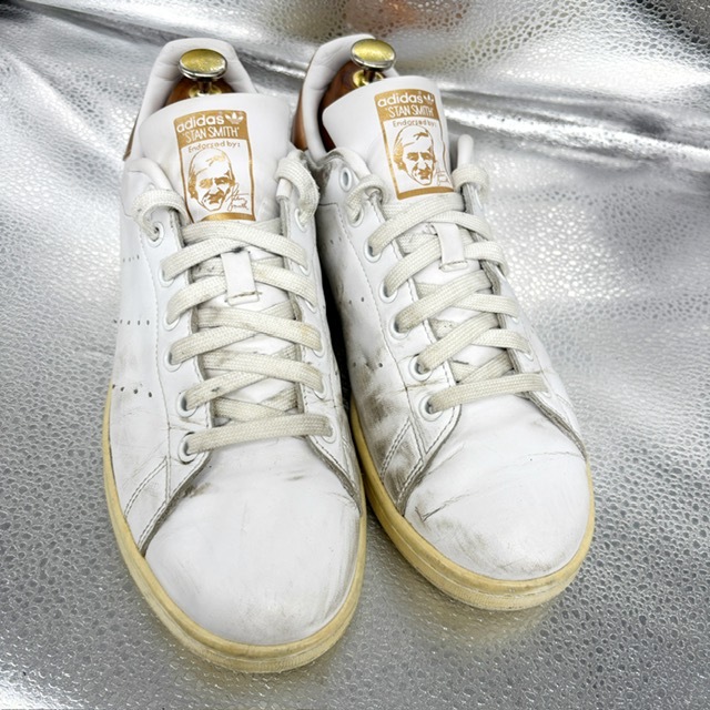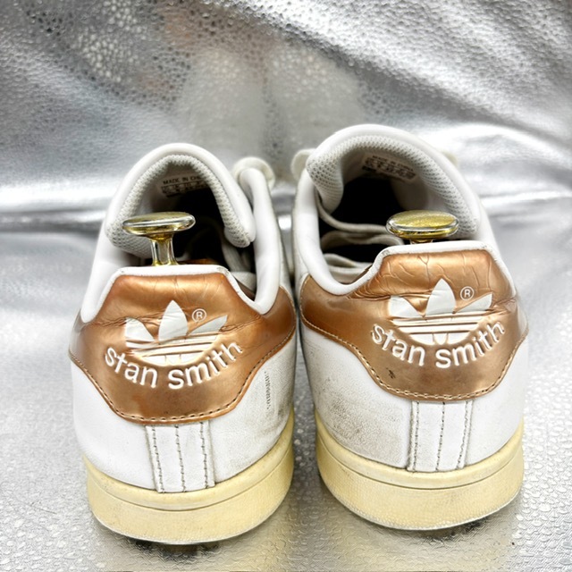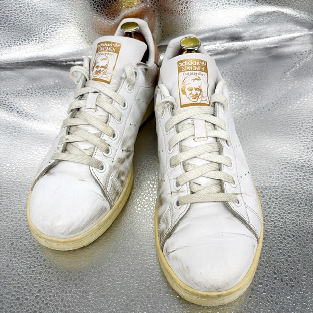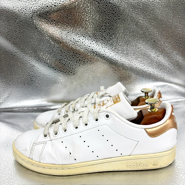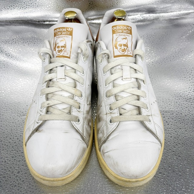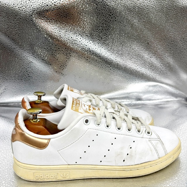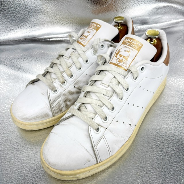 ご覧いただき、ありがとうございます。 オシャレで高級感のあるアディダス スタンスミスのスポーツシューズです。 デザイン性:機能性共に定評のある商品です。 1足押さえてあるとファッションの幅も広がり大活躍するお勧めの商品です。 中古品のため、スレや傷、ヨゴレ等ありますが、その分お値打ちにしております。 詳しい状態は画像でご確認ください。 商品のサイズについて 表記サイズ 26.5cm アウトソール全長 約27.7cm 全幅 約9.8cm (素人採寸) ●状態①「外観」 履きジワ、着用に伴う擦れ、傷がございますが、着用に支障はございません。 くわしくは画像で確認ください。 ●状態②「ソール・インナー」 インソール内ロゴ残っています。 ●その他・付属等なし、シューズキーパーは撮影用です。 | |||