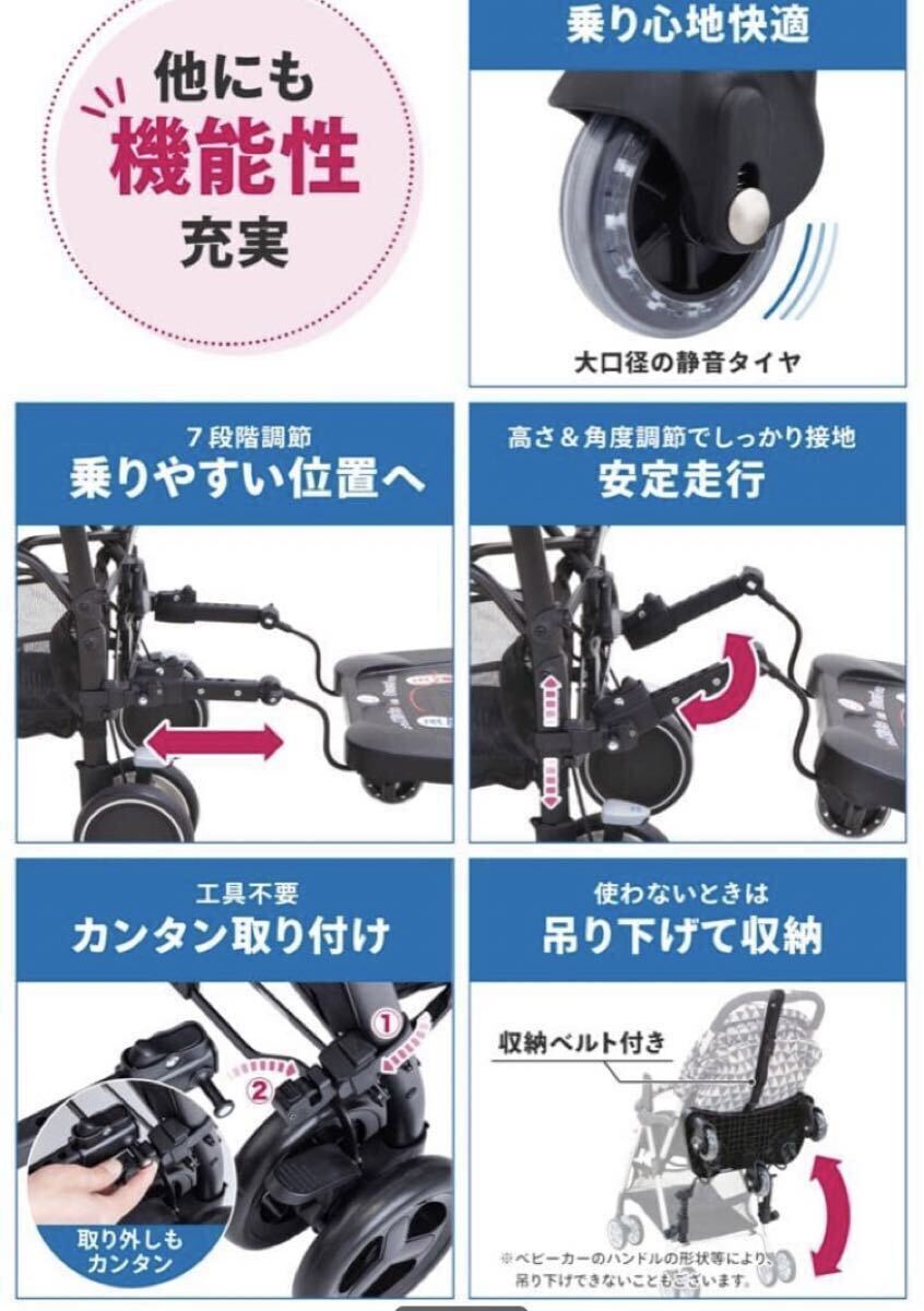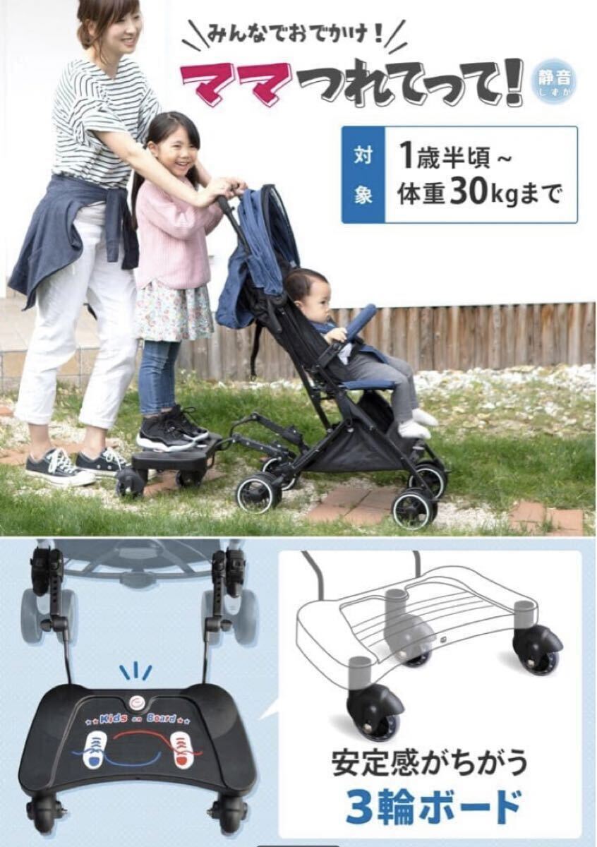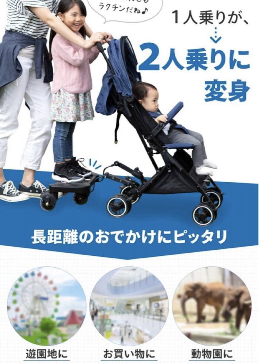 ベビーカーの後輪に取り付けるだけで上の子も一緒にベビーカーに乗れるボードです。