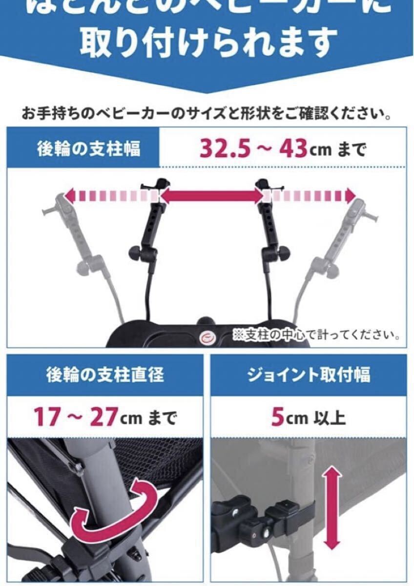 背面式ベビーカーかつ後輪の支柱と支柱の中心同士の幅約32.5~43cm、支柱直径17~27mm、ジョイント取り付け部分5cm以上で取り付け可能。