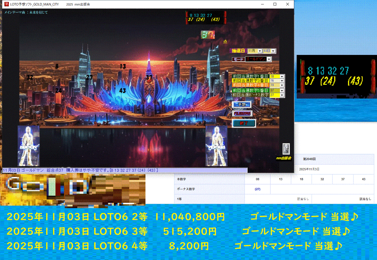 新作 [LOTO予想ソフト_GOLD_MAN_CITY] 2025年11月03日 LOTO6 .2等 11,040,800円 x2 当選♪
