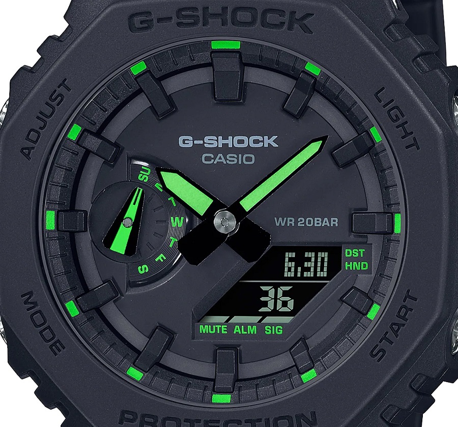 ブラックをベースにネオンカラーのグリーンを文字板の随所に使用し、視認性を高めています。人気のオクタゴンベゼルが特徴的なGA-2100のカラーバリエーションで、クールにまとめました。