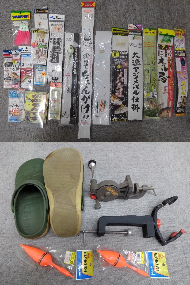 ●★24―052★釣り用品大量まとめ シマノ フローティングベスト/ウキ/釣り針/仕掛け/高速リサイクラー/ダイワ デッキサンダルM [140]
