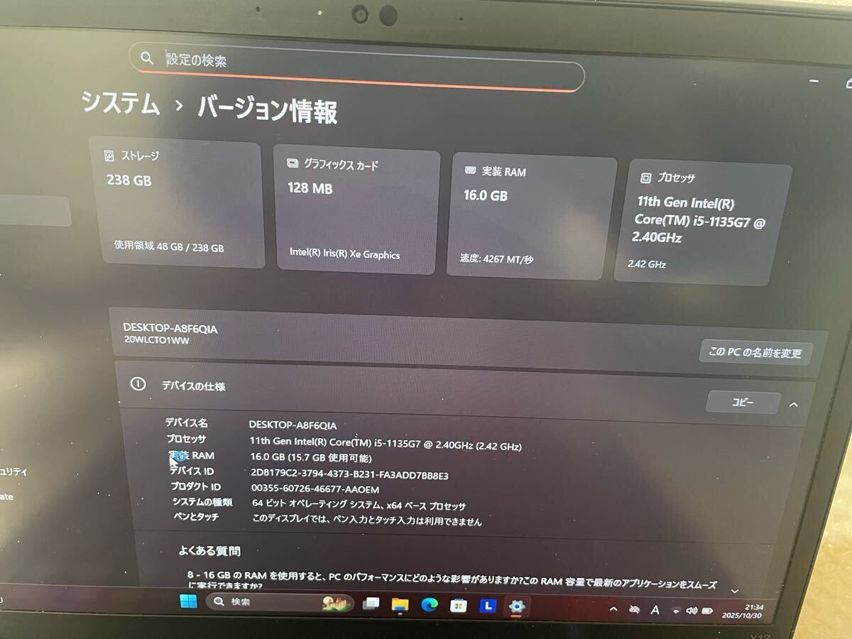 Lenovo ThinkPad X13 Gen2 i5-1135G7 2.4GHz メモリー16GB SSD256GB カメラ 無線LAN ジャンク品