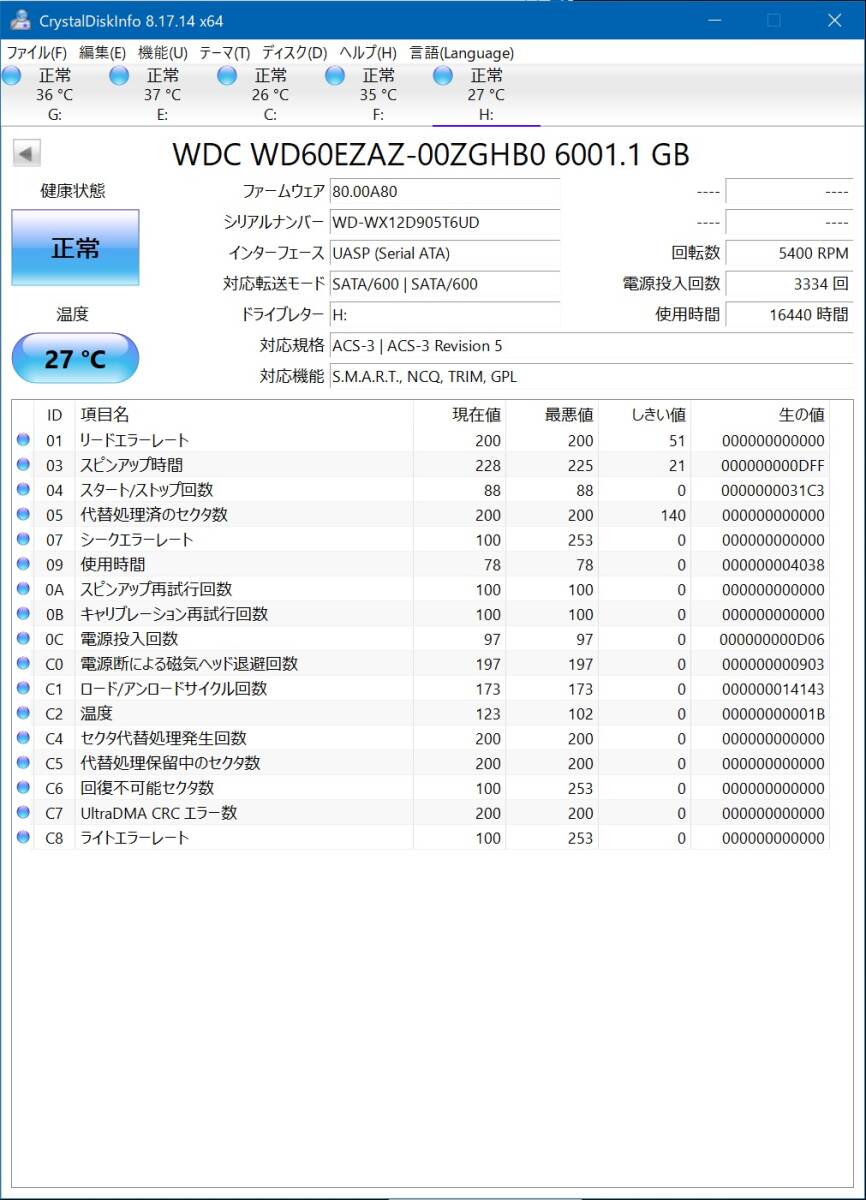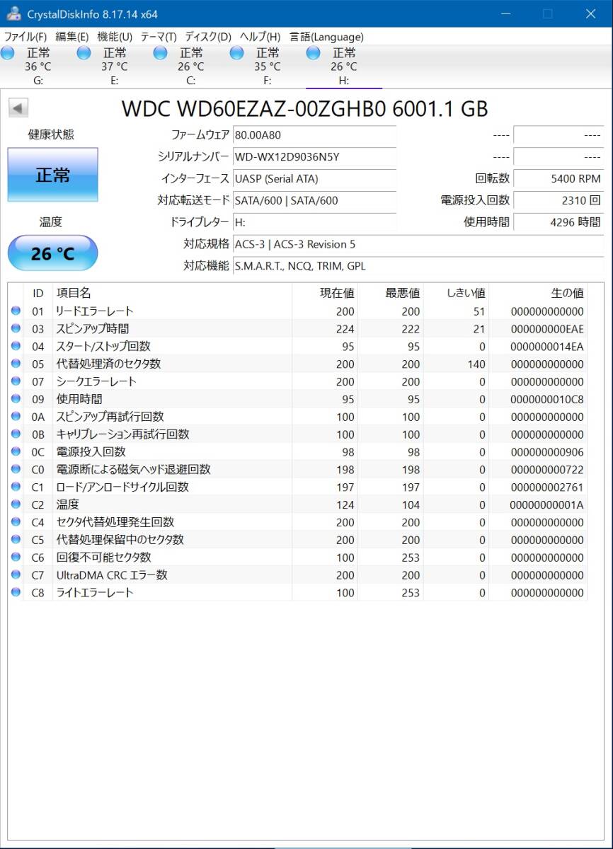 CrystalDiskInfoでの診断では「正常」と言う判定ですが、ハードディスクの性質上、いつ壊れるかは分かりません。