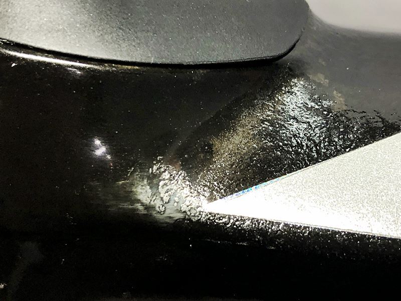 ボトルケージの締付による塗装の浮き、ヘコミが見られます。