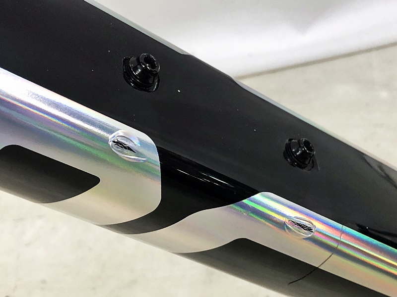 ダウンチューブのプリズムカラーのロゴと比べ、トップチューブのシルバーラインは光を反射せず、のっぺりとした印象です。