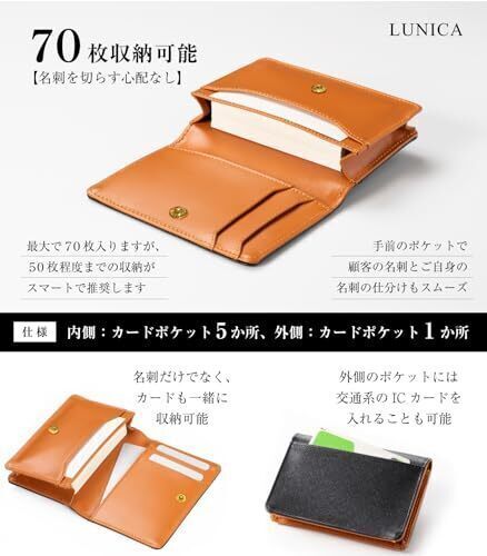 【大容量/70枚収納可能】◆仕様/内側:カードポケット5か所、外側:カードポケット1か所 メインポケットには70枚の名刺を収納でき、名刺を切らす心配がありません。ボタン留が付いているため、商談中に開いてくる心配もありません。手前のポケットで顧客の名刺とご自身の名刺の仕分けもスムーズです。また、ポケットがたくさんあるので、名刺だけでなく、カードも一緒に収納可能。外側のポケットには交通系のICカードを入れることもでき、定期入れとしてもご使用いただけます。