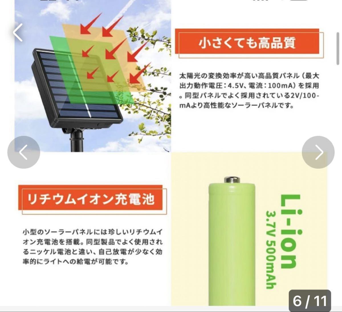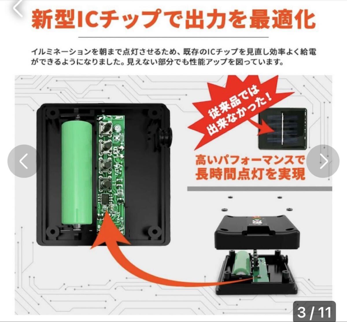 2022年最新型、屋内外両用 防水型、 雨の日、曇りの日も朝まで点灯可能。その秘密は太陽光の変換効率が高い高品質パネル(最大出力動作電圧:4.5V、電流:100mA)を採用。同型パネルでよく採用されている2V/100mAより高性能なソーラーパネルです。リチウムイオン充電池。小型のソーラーパネルには珍しいリチウムイオン充電池を搭載。同型製品でよく使用されるニッケル電池と違い、自己放電が少なく効率的にライトへの給電が可能です。