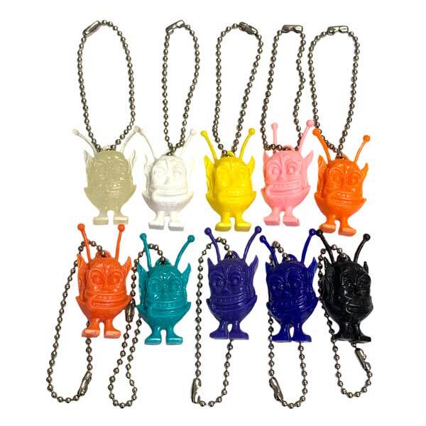 マニア必見!Martian Fink PVCキーホルダー 10色セット!サイズ: 約 H4×W2cm(本体)素材: プラスチック1965年、Martian Finkは自動販売機のおもちゃとして登場!当時人気のエド・ロスがデザインした「Rat Fink」のキャラクターを、ヘナルノベルティ&プレミアム社が火星人バージョンとして登場させました。しかし、Rat Finkの権利侵害を避けるため、ヘナル社は「Moon Goon」に名前を変更して販売開始。ですが、残念ながらMoon Goonはあまり売れませんでした…。その後、Martian Finkはコアなファンの間で幻のアイテムとして語り継がれ、1990年代後半にはアーティストのデイブ・バーク氏が商標登録を行い、Martian Finkが復活したのでした。こちらはデッドストック品ですので、金属部分のサビや汚れ、素材の経年劣化によるべたつきがある場合がございます。デッドストックの風合いを理解いただける方のみ、ご購入をお願い致します。また、掲載画像は実物と若干色味が異なる場合がありますので、予めご了承ください。※実店舗や他の販売サイトと在庫を共有しているため、売り違いが発生する可能性がございます。その際には、何卒ご理解いただけますようお願い申し上げます。お客様にはご迷惑をおかけしないよう、努めてまいります。