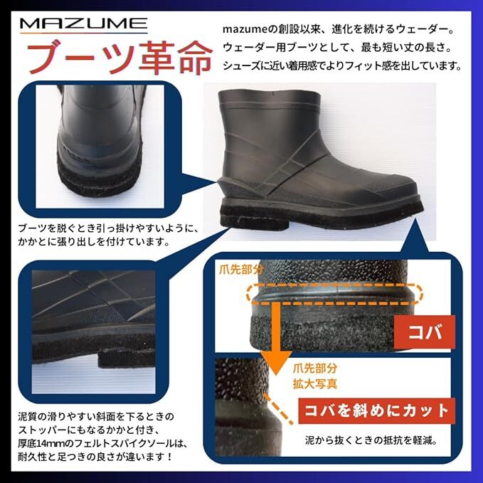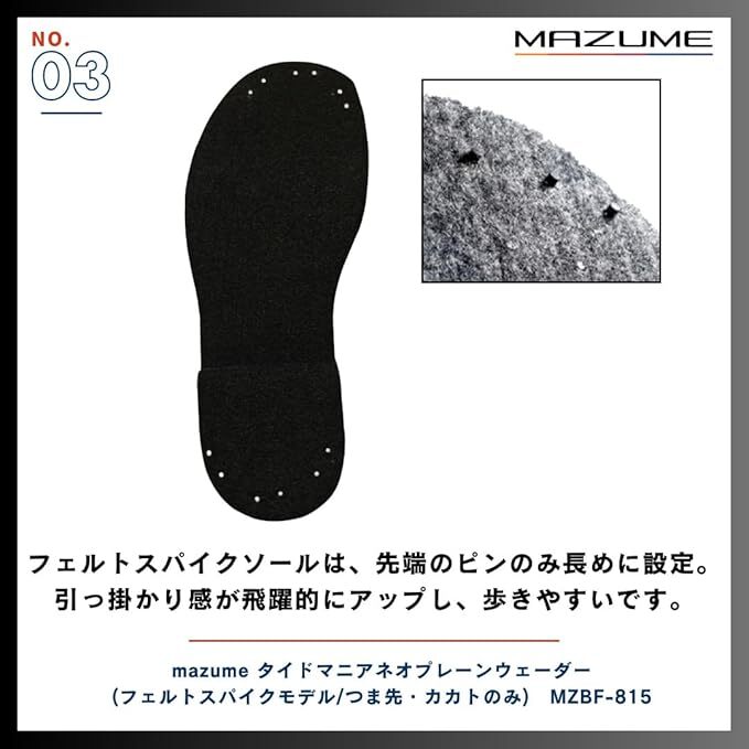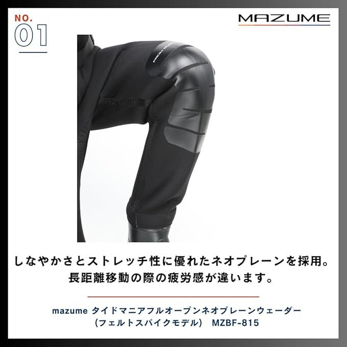 | mazume MZBF-815 タイドマニア ネオプレーンウェーダー ブラック L 新品を出品致します。 水温20℃以下が目安。 今までネオプレーンウェーダーを履いた事がない人にこそ履いてほしい! というのも、保温力に優れたネオプレーンウェーダーを履いた事がないというアングラーが意外と多いのが事実だからです。 そういったアングラーは、PVC製ウェーダーに何枚もインナー重ねています。 当然、動きにくくキャスト精度も下がり釣果が出ません。 そして冬は釣れないシーズンと判断してしまうのです。 そんなアングラーにこそ、履けば釣果が変わる事を実感してもらいたいとの思いで、リリースしたのがタイドマニアネオプレーンウェーダーです。 従来のアジア人向けのサイズ感を見直し、股下を長く延長した事で、高身長の人も問題なく着用できます。 また、従来のモデルで問題なく使用できていた人も股下に余裕ができる事で下半身の関節の可動域が広がり機動力の向上にも繋がります。 しなやかさとストレッチ性に優れたネオプレーンを採用。 長距離移動の際の疲労感が違います。 ベルトループを2ヵ所にする事で、ショルダーパットがずれなくなり、肩への負担が軽減されました。 フェルトスパイクソールは、先端のピンのみ長めに設定。 引っ掛かり感が飛躍的にアップし、歩きやすいです。 【サイズ】 L 足:26.5cm 履き口:104cm ヒップ:104cm 太もも:58cm 股上:63cm 股下:84cm 【カラー】 ブラック 【メーカー本体価格】\29,700(税込価格) ※出品商品の送料は『5kg以上20kg以内』のサイズとなります。 | ||||||||||||||||||||||||||||||||||||||||