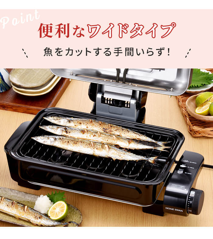 さんま4匹が焼けるフィッシュロースター。 裏返し不要の上下ヒーター。 焼き網の裏表で高さを変えることができます。 30分まで対応タイマー付き。 ニオイを軽減する消臭フィルター付き。 分解できて水洗いOK。(※ヒーター部除く) |