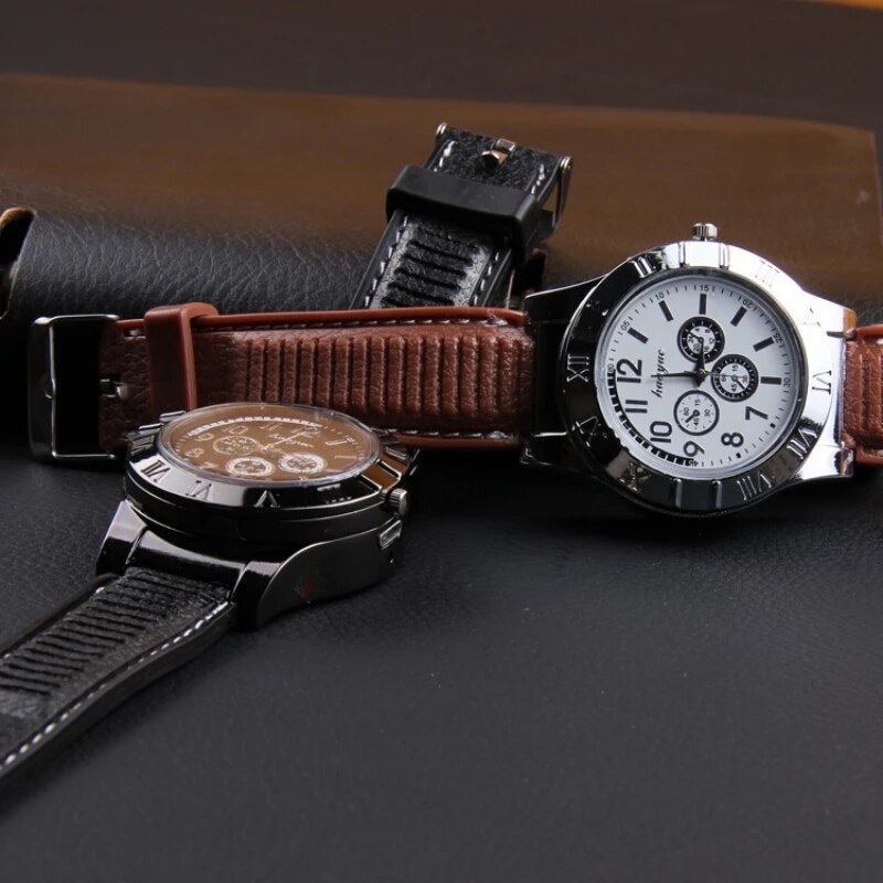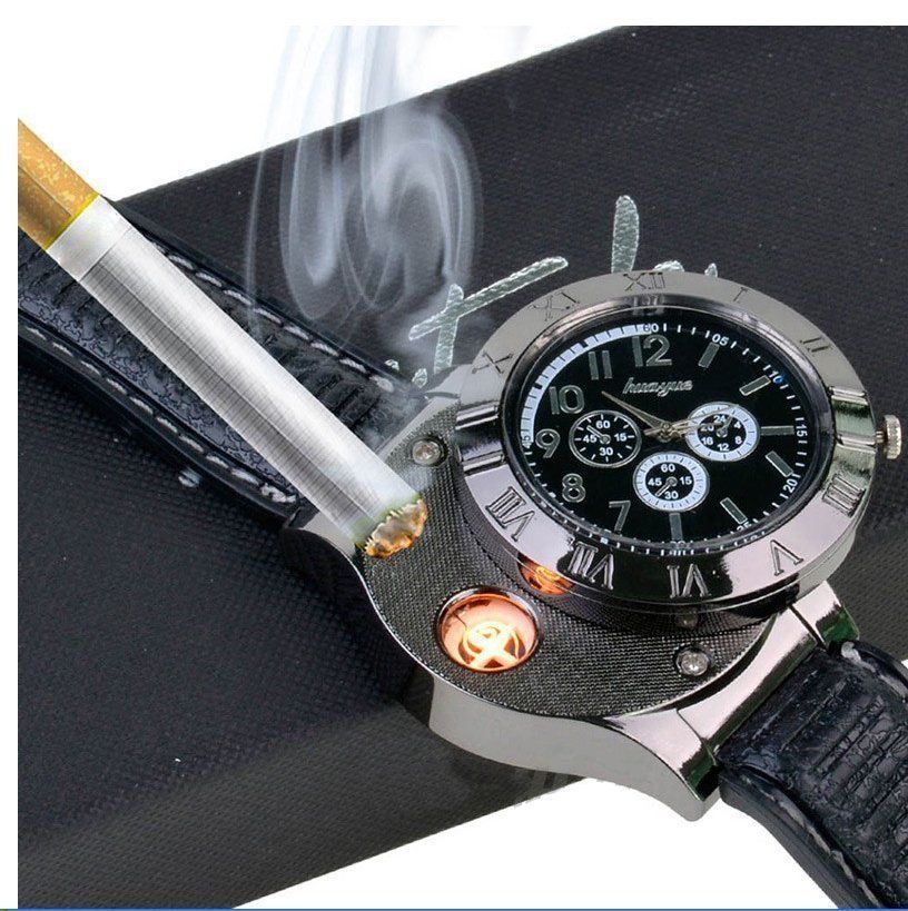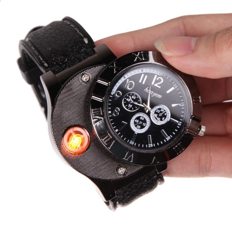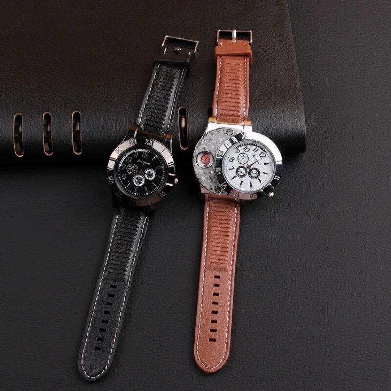 | 商品説明 | 店頭では中々見ることのない、電子ライターが内部に仕込まれたライター腕時計です。 内蔵されているバッテリーから熱線が暖められることによって点火する仕組みです。 文字盤を横にスライドさせると自動的に点火します! 15秒ほどで火は自動的に消え、また点火する範囲がごく小さいので安全です。 熱線ですので風があってもライターが使えて便利ですよ♪ カジュアルにもフォーマルにも対応できる優秀なデザインです。 バイクに乗る方、屋外での作業が多い方に特におすすめです! 高性能高分子アルミバッテリー内蔵です。 電子ライター充電のためのUSBケーブルも付属します。 充電中は赤いランプが付き、完了すると消灯します。 ※こちらカラーはブラック(黒)になります。 色違いのブラウン(茶色)もございます。 ・商品スペック 文字盤サイズ:4.5cm フレーム:金属 バンド:ラバー バンド長さ:26cm バンド幅:2.2cm 充電時間:2時間 |