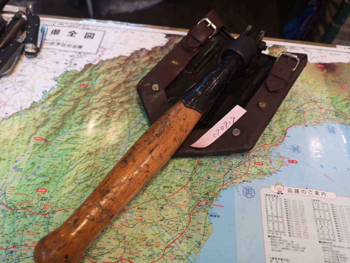 ルーマニア軍にて採用されていたフォールディングシャベルです。 雰囲気のあるレザーのカバーが付属したお洒落なアイテムです。 取っ手は木製になり、持ち手側にむけてシェイプの効いた丸みのある作りになっています。 持ち運びもしやすく、カバー付きなので安心して移動ができます。 キャンプや園芸などに最適です。 また、ディスプレイとしてやインテリア雑貨としてもオススメです。 サイズ:折り曲げた状態 約37cm / 伸ばした状態 約56.5cm シャベル部分 約16cm×約22.5cm。 沖縄離島を除く全国500円でお送りいたします、落札価格にプラスでお願いいたします。キャンプ用品