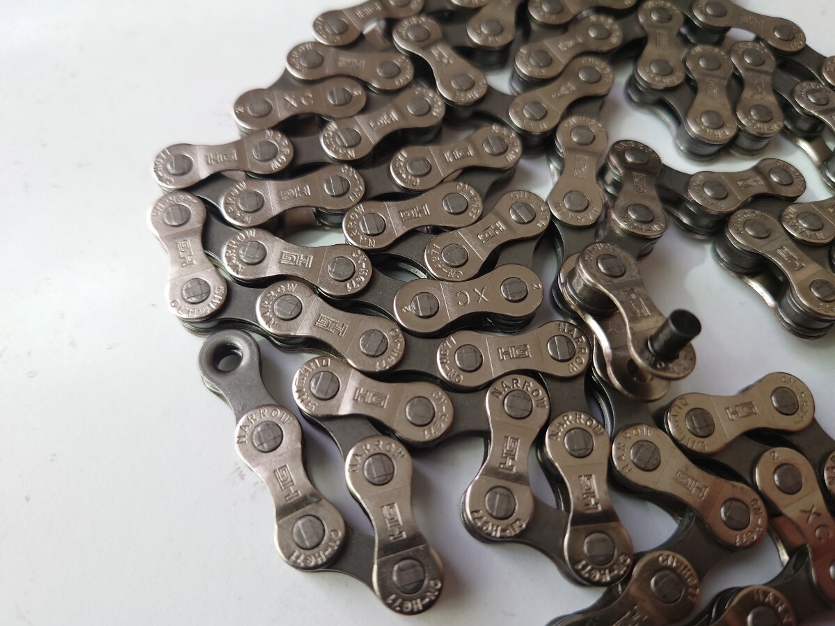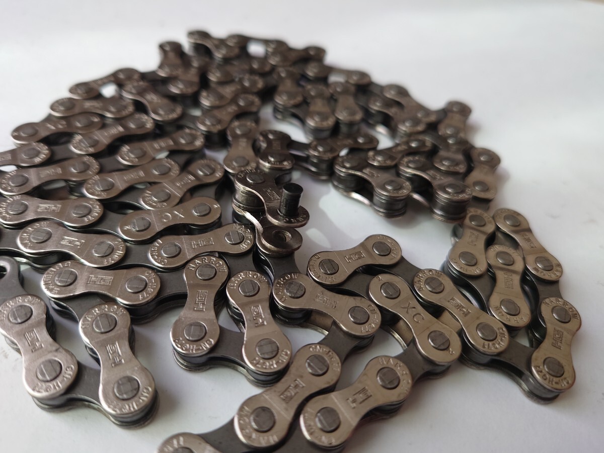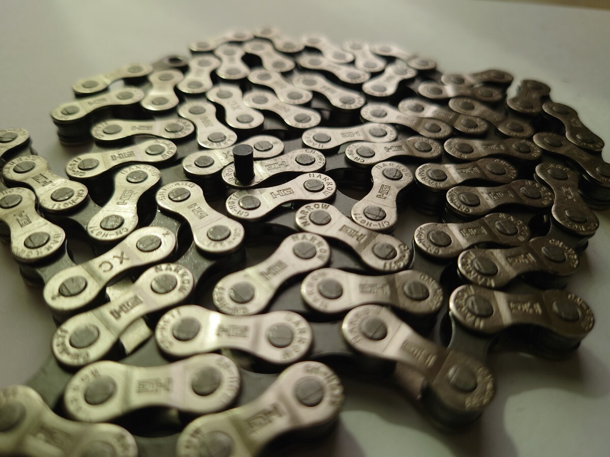 CN-HG40の上位モデルのCN-HG71となります、シマノの6~8速チェーンの中では最上位モデルでメッキ処理されてサビに強くなっております、、ピンにもクロマイジング処理がされていて耐摩耗性が上がってます。