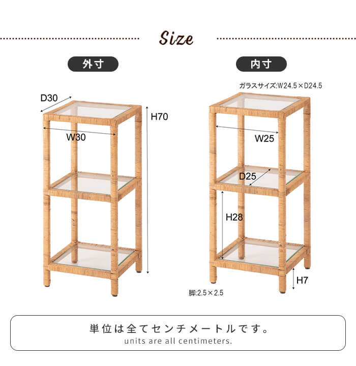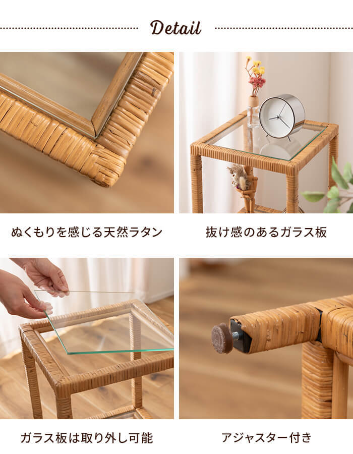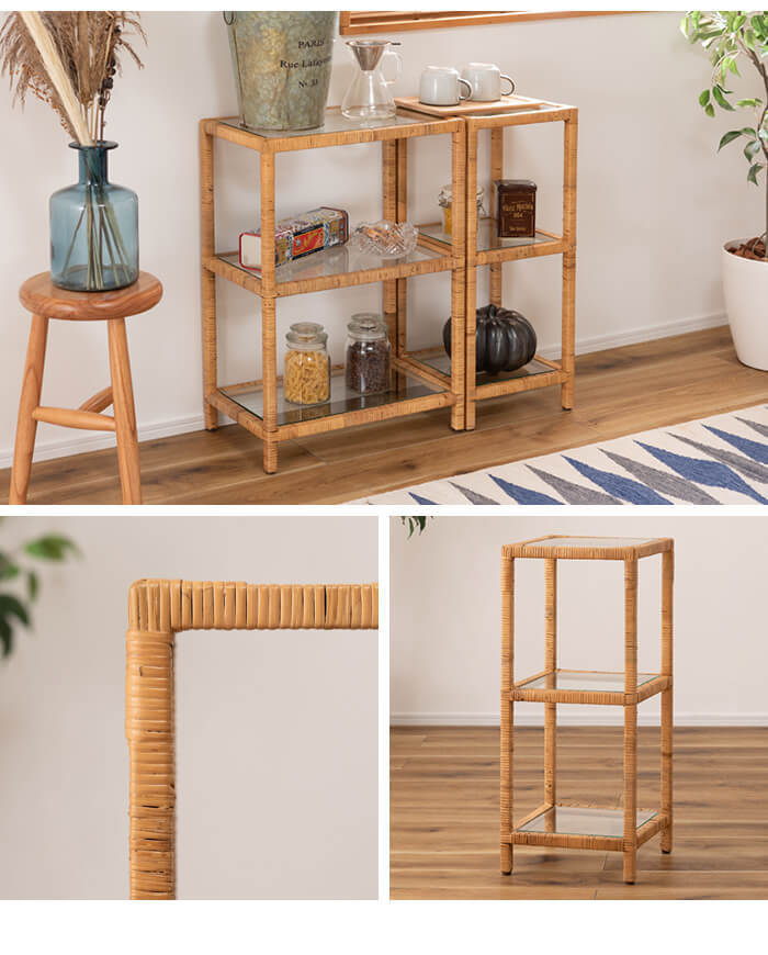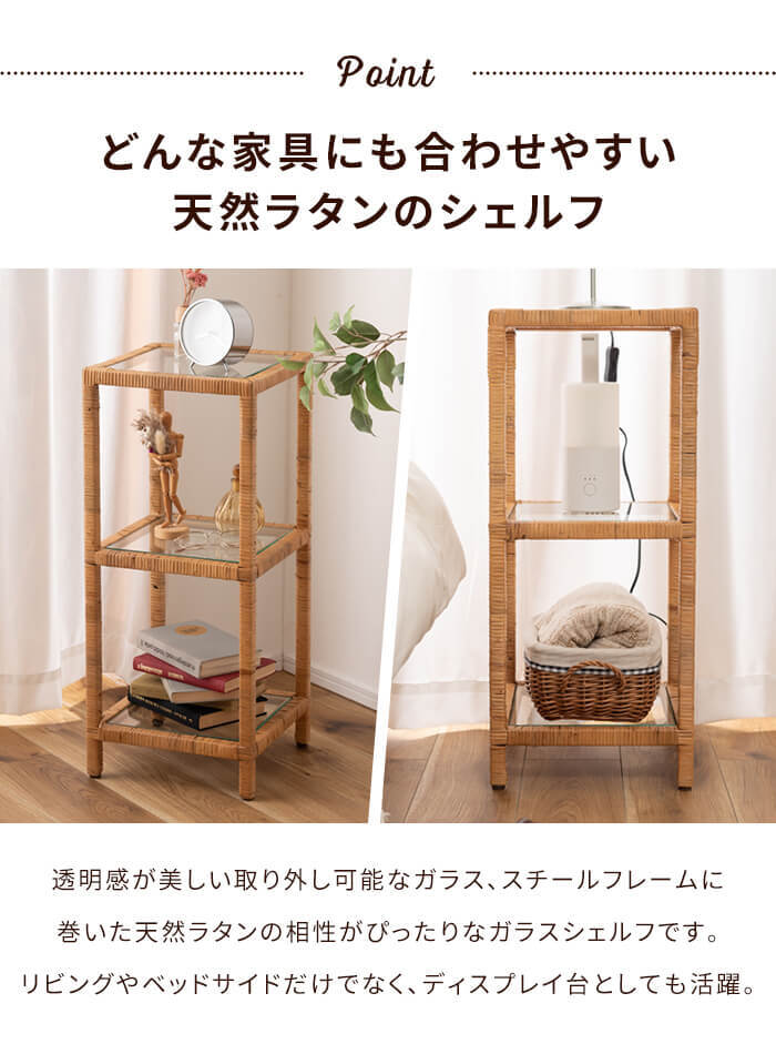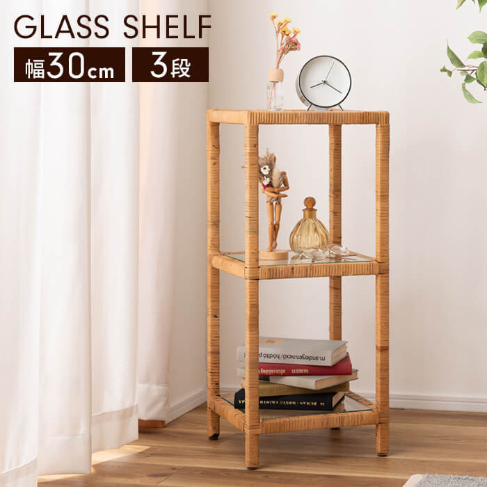 | シェルフ ガラス ガラスシェルフ ラタン 籐 クリア 収納 収納棚 ラック オープンラック 3段 三段 見せる収納 シンプル 北欧 ナチュラル ナイトテーブル 強化ガラス |