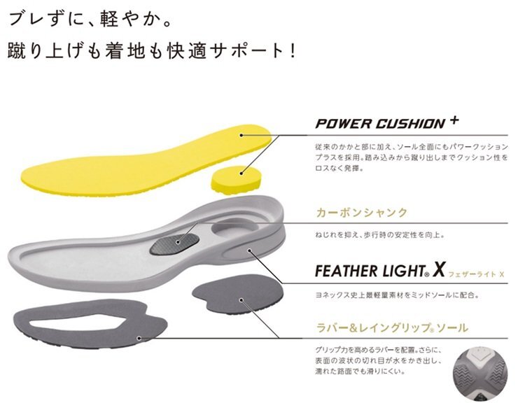 | 12mの高さから生卵を落としても割れずに6m以上跳ね返す 「パワークッションョンプラス」搭載 。疲れにくい!!ヨネックスのパワークッション、ウォーキングシューズです。 かかとから指先まで全面フォロー! パワークッションプラスで快適ウォーク 濡れた路面も滑りにくい レイングリップソール 片足約260g(26.0cm) ■撥水ストレッチPUレザー 伸縮性が高く、ソフトな履き心地ながらもフィット感はしっかりとした人工皮革。 様々な甲の高さや足幅にも柔軟に適応します。 ■ベリークール 裏面のパワークッションは格子状に成型。表面は水分と接する熱を吸収する「キシリトール」でムレを軽減。 ウェーブが足の滑りを防止し、快適な履き心地。 ■レイングリップソール 波状の切れ目が地面を捉え、濡れた路面のグリップ性が向上し、滑りにくくなりました。 | |