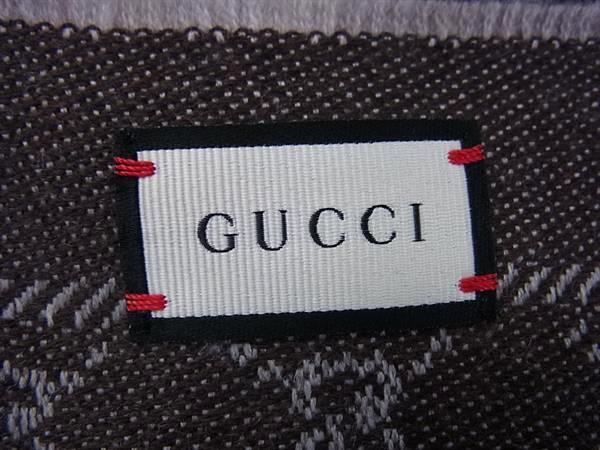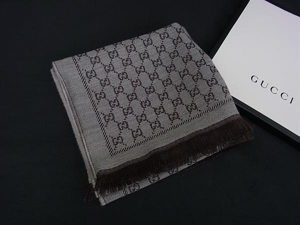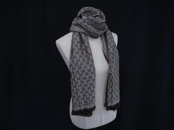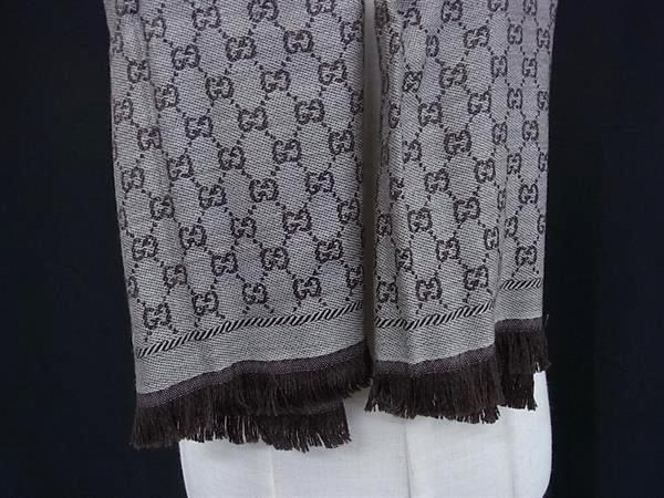 1円 ■美品■ GUCCI グッチ GG柄 ウール100% フリンジ マフラー ストール ショール 防寒具 レディース グレージュ系×ブラウン系 FL7561