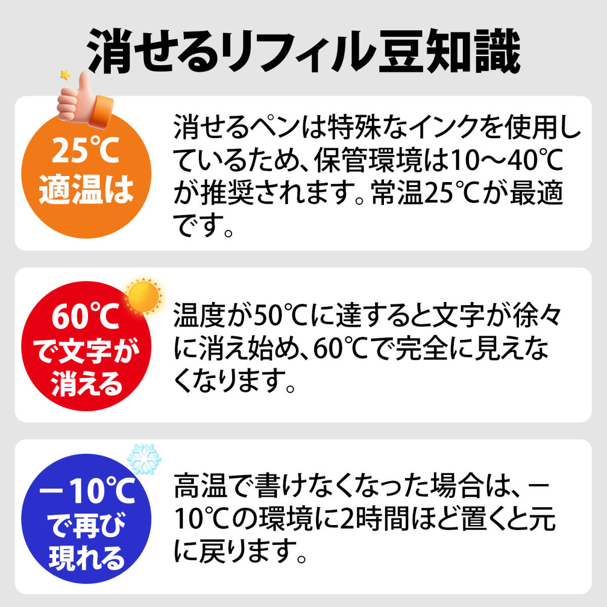 | この商品について | 【消せるインクでミスを恐れない】:書き間違えても安心。ペン後部の専用ラバーで簡単に消せる可消しタイプ。摩擦熱でインクが透明になる仕組みで、きれいに修正できます 【温度変化で消える・戻る!ユニークな温感インク】:約25℃で最も鮮やかに発色。50℃以上になると文字がゆっくり消え、60℃では完全に透明に。冷凍庫(−10℃)で2時間ほど冷やせば、再び文字が戻る驚きの再生機能付き。 【3色一体型で効率アップ】:黒・赤・青の3色を1本に搭載。ボタンひとつでスムーズに切り替えられる精密な押し出し構造で、勉強やビジネスの場でもストレスなく使用可能。 【交換可能なリフィルで経済的、お手頃価格】:純正リフィルを使い切ったら、同じリフィルをご購入いただけます。ペンを廃棄する必要がなく、再利用できるので経済的です。 【速乾性インクでなめらかな書き心地】:にじみやすい紙でもインクが素早く乾きます。メモ、議事録、手帳、筆記などに最適です。 |