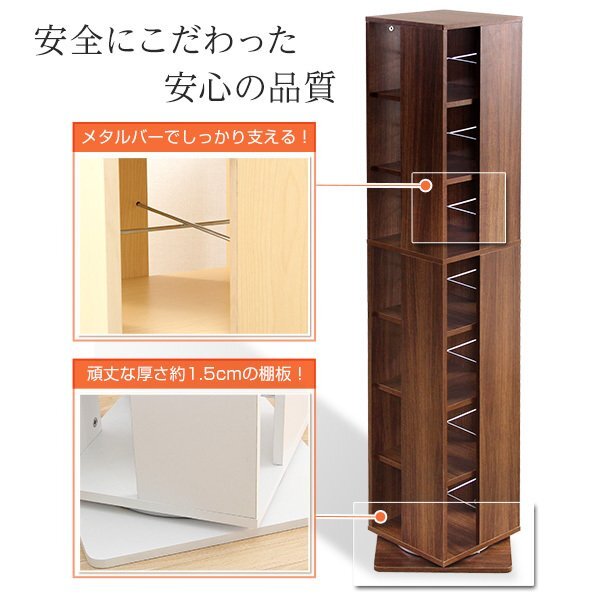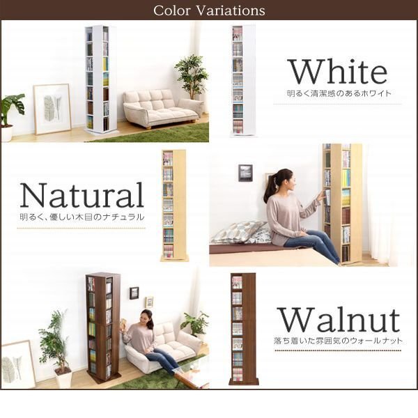 | 【ポイント】 くるくる回る回転式なので探しやすい! コンパクト設計だから省スペースにおけます。 本やDVDが約280冊収納できる大容量です。 カラーはインテリアに馴染む3色がございます。 |
