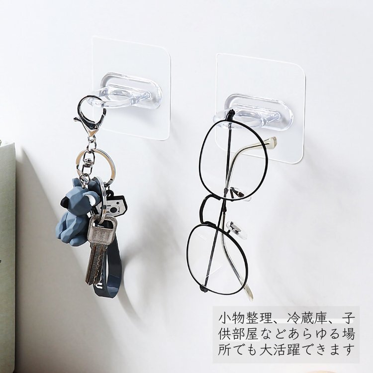 強粘着で跡の残らないフック、糊が残らず、壁に傷をつけず、どんなところでもお使いになります、様々な素材の壁面に対応可能、ガラスやタイル、木製パネルにもご利用いただけます