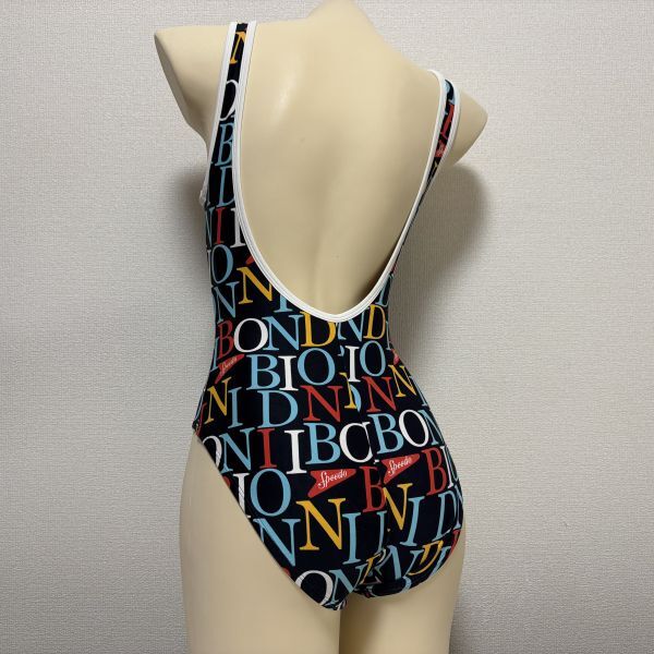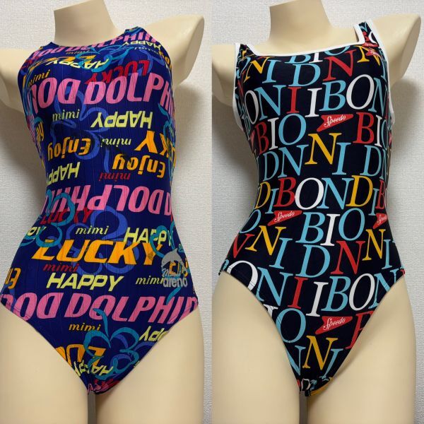 3031【2枚セット】女子競泳水着Lサイズ★スピードarena★背中あき・光沢濃紺ネイビー白ホワイトカラフルロゴ柄★男性も★旧ミズノ製